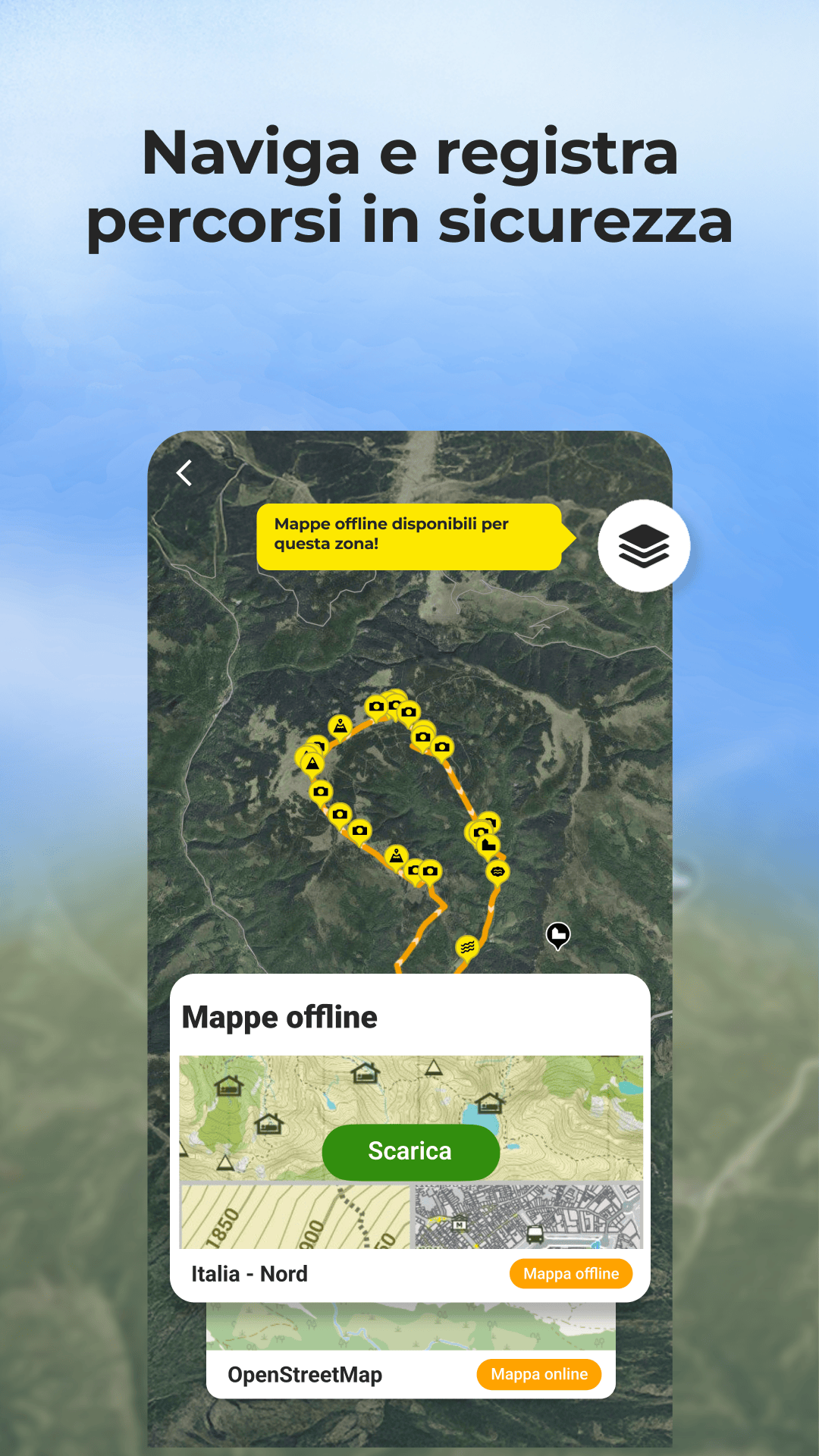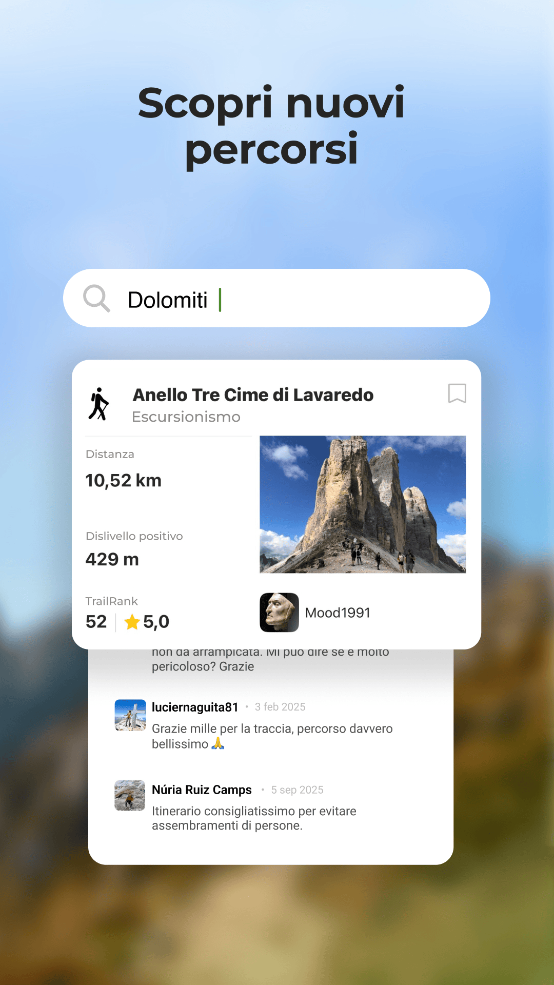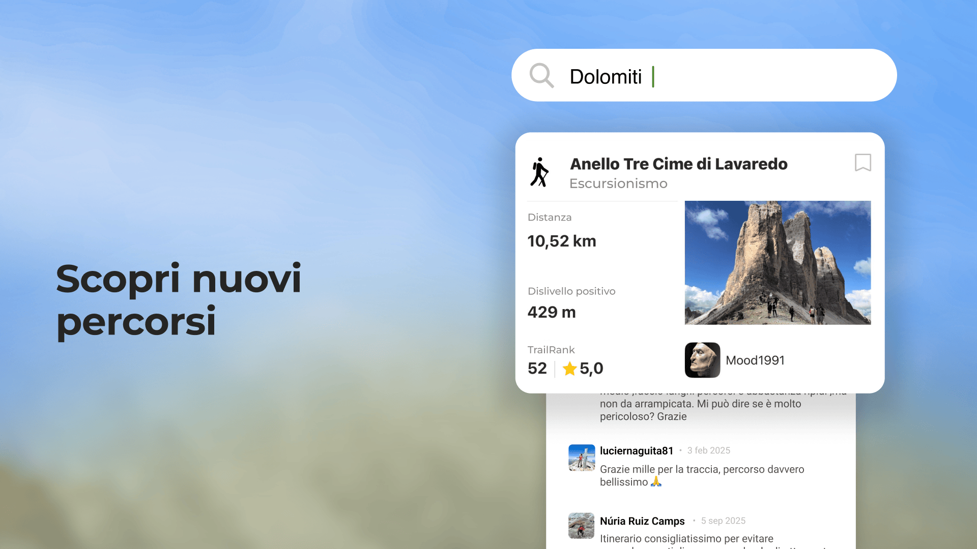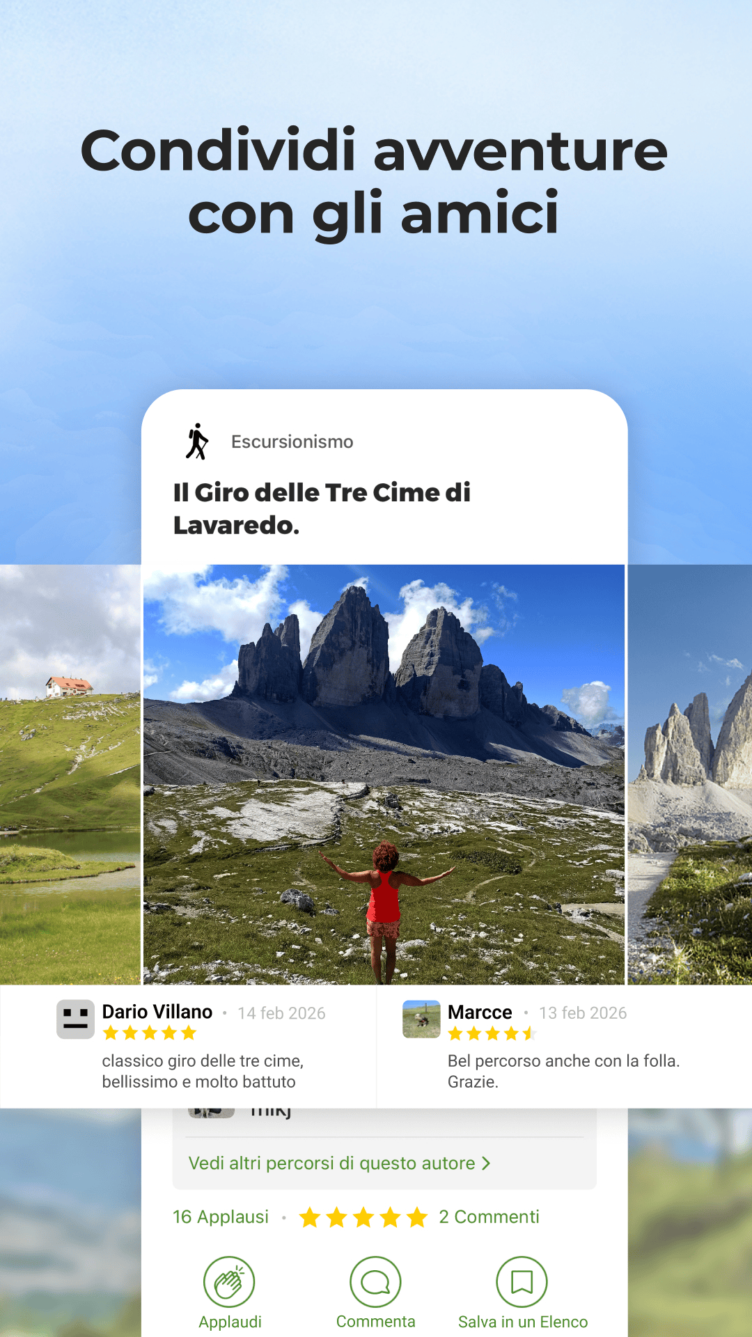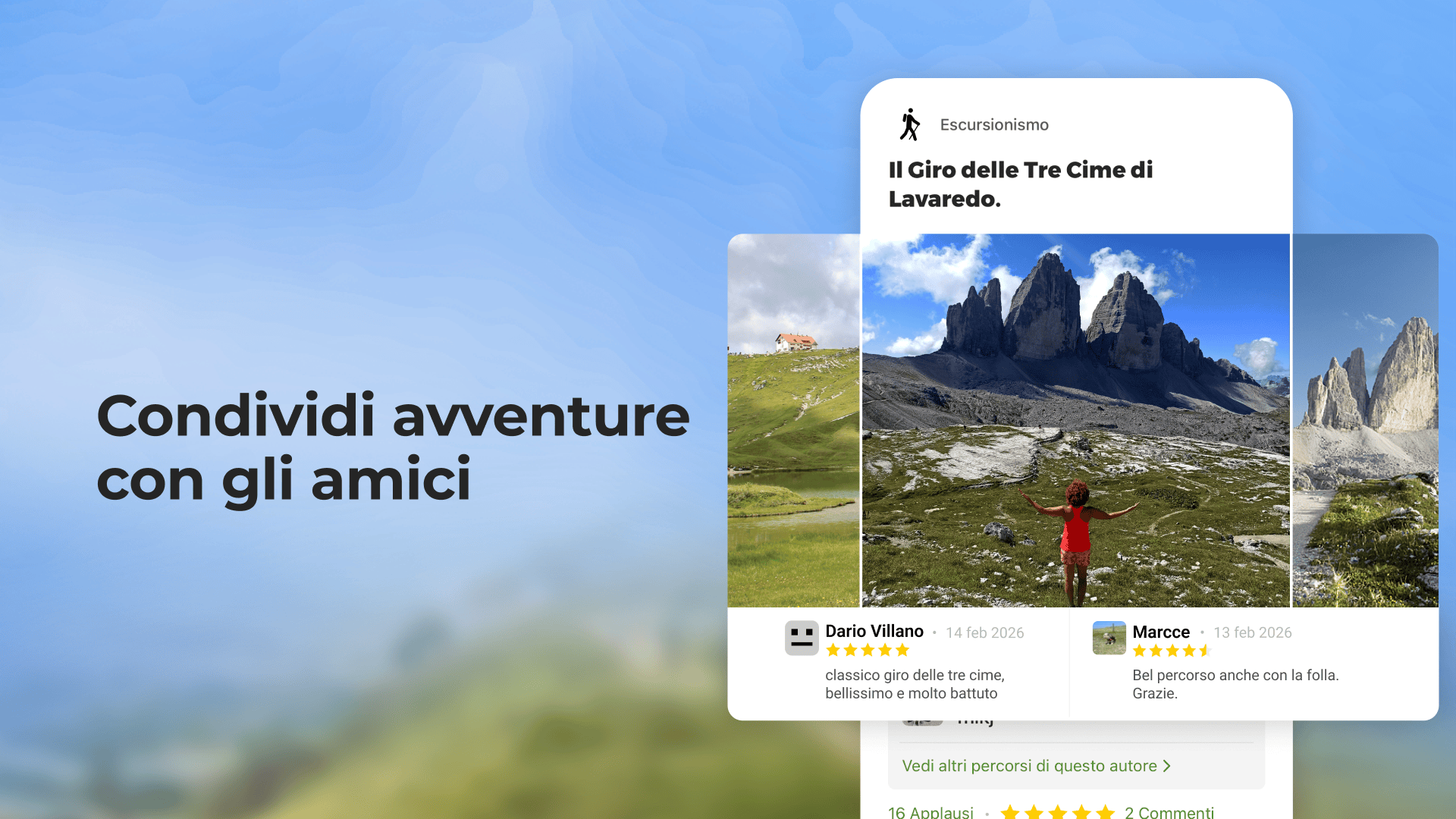 Segui percorsi di montagna e proposte sempre nuove per escursioni su Alpi e Appennini, o attraversa famosi e splendidi cammini come la Via Francigena, la Via degli Dei e l'Alta Via delle Dolomiti. Entra a far parte di una comunità in cui milioni di amanti della natura, dei viaggi e dello sport all'aria aperta condividono le loro avventure, mappe e percorsi, dalle passeggiate dietro casa fino alle escursioni nelle aree più remote del pianeta.