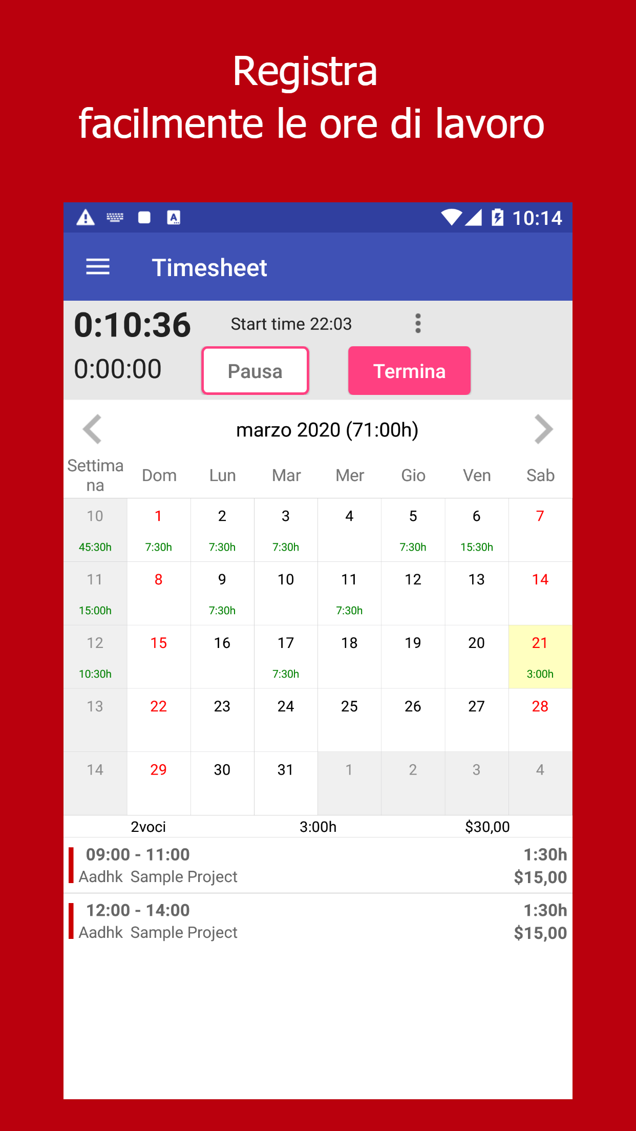 Work Log è un'app semplice e veloce per la registrazione delle ore lavorative, l'invio di schede orarie o la fatturazione dei clienti. Dipendenti, appaltatori e liberi professionisti utilizzano Work Log come una soluzione di fatturazione o bolletta mobile semplice e professionale. Tieni traccia delle tue ore di lavoro, invia la scheda dei tempi ai responsabili, calcola automaticamente lo stipendio e fattura ai tuoi clienti sul telefono. Sincronizzazione cloud ★ Schede orarie facili da usare su più dispositivi. Caratteristiche principali ★ Registra facilmente le ore di lavoro ★ Visualizza le tue ore di lavoro e i guadagni ★ Calcolo automatico degli straordinari ★ Tiene traccia di più lavori e clienti ★ Analizza rapidamente le ore di lavoro ★ Crea fatture in pochi secondi ★ Schede orarie in formato Microsoft Excel (XML), CSV e HTML La versione gratuita di Work Log può essere utilizzata per avere un numero limitato di rapporti e fatture. Puoi eseguire l'aggiornamento in-app per creare un numero illimitato di rapporti, fatture e sincronizzazione cloud. Con Work Log, sarà facile inviare la scheda orario e inviare facilmente fatture PDF professionali. P.S. Se ti piace l'app, ci farebbe molto piacere se potesse darci una buona valutazione. Aiuta davvero nella nostra missione di rendere il foglio di tempo per le piccole imprese il più veloce e senza problemi possibile. Grazie per aver scelto la nostra app Work Log!