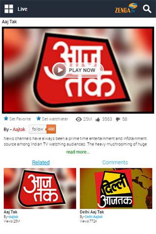 Zenga TV è un'applicazione TV mobile gratuita che permette agli utenti di guardare più di 100 canali TV in diretta, 1000 di video, film indiani e di Hollywood e contenuti musicali. L'applicazione ha varietà di contenuti indiano e internazionale in vari generi come l'intrattenimento, notizie, bambini, regionale, stile di vita, il cibo e molti altri. Gli utenti possono utilizzare Zenga TV su reti 2G, 3G, 4G e Wi-Fi.