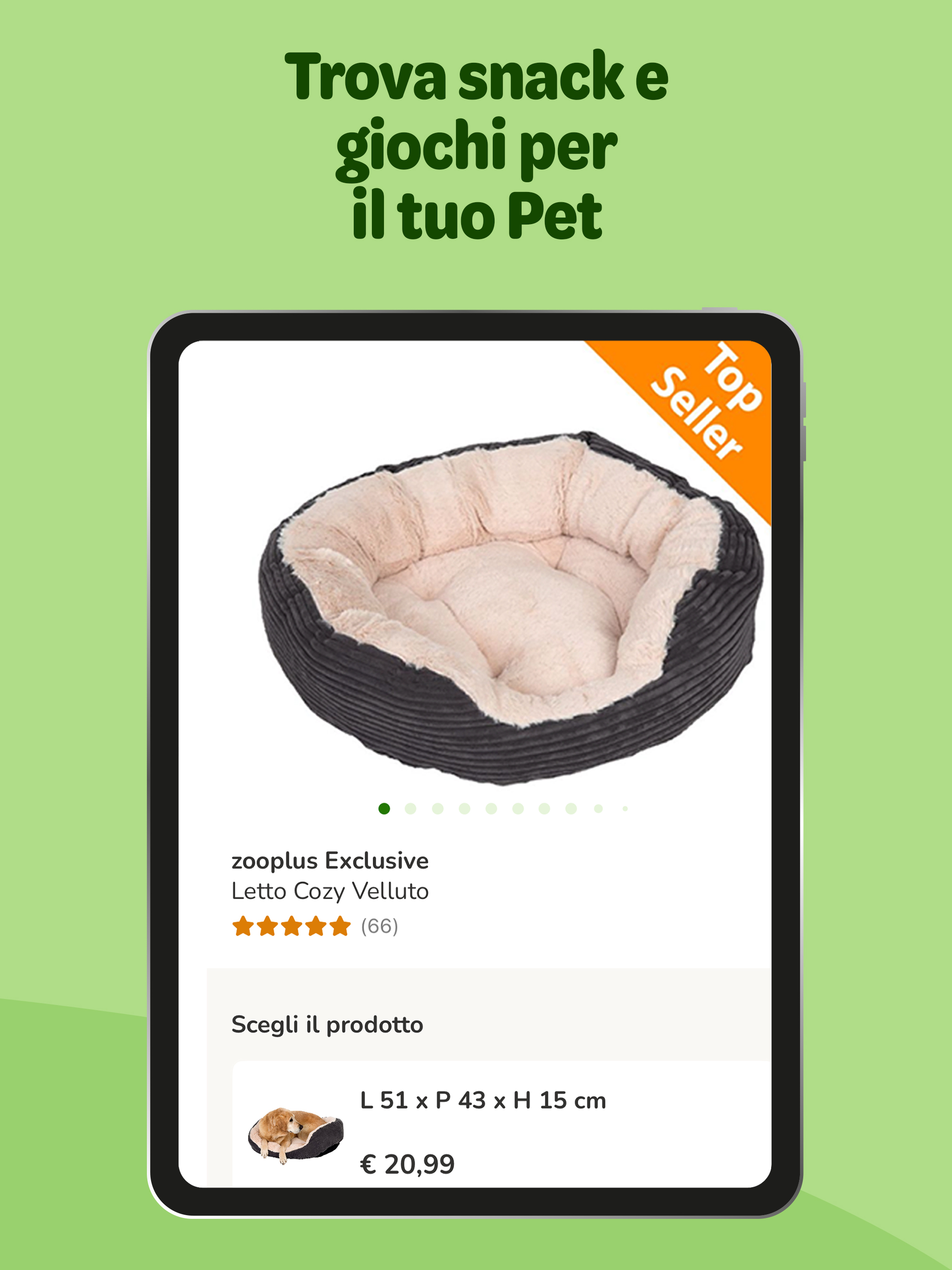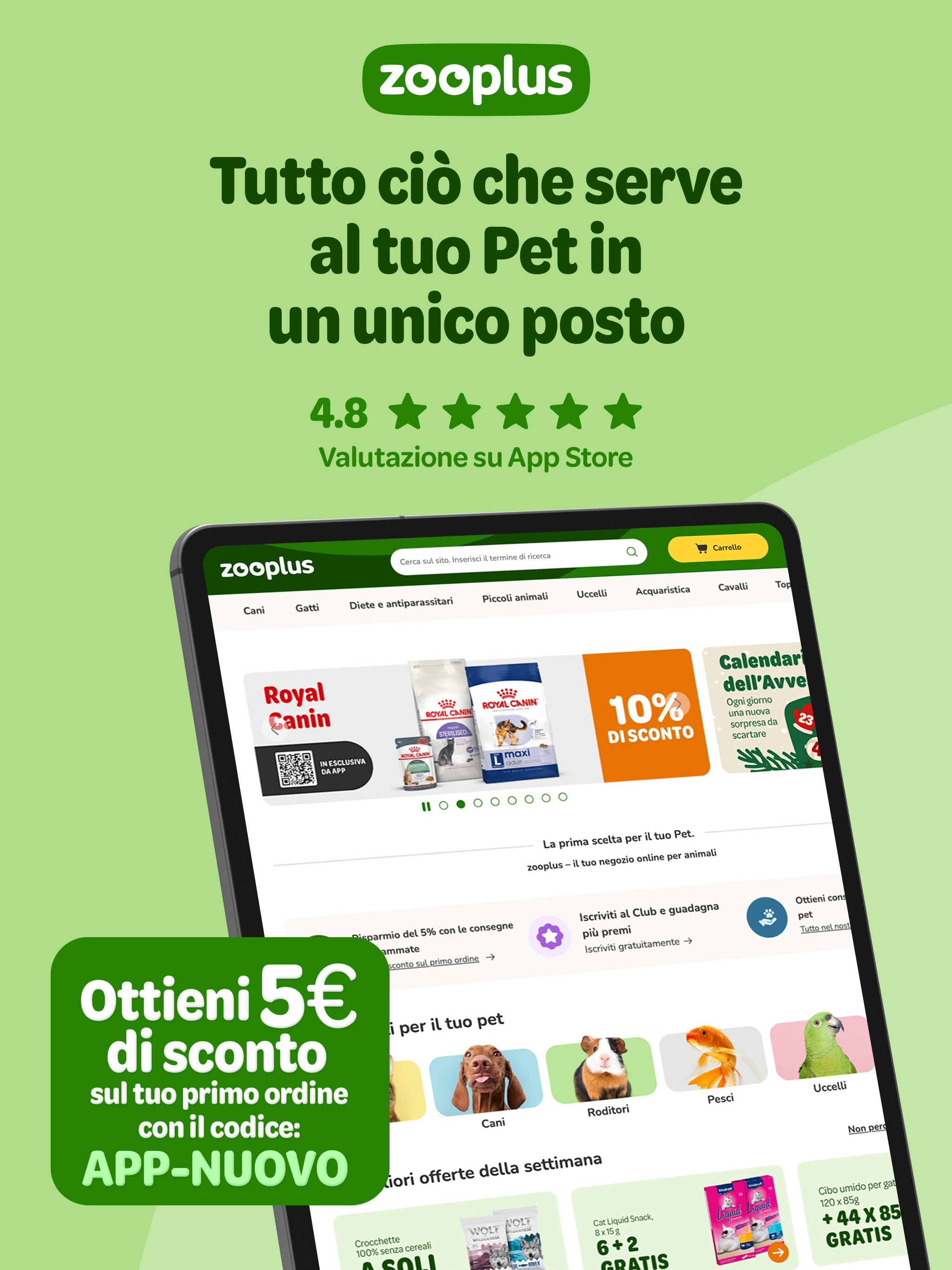 Scarica gratis l’app zooplus e ordina cibo per animali domestici: cani, gatti, conigli, criceti, uccelli, pappagalli, anatre, pesci e persino cavalli. Trova tutti gli accessori per i tuoi amici a quattro zampe nel nostro negozio di animali, sempre e ovunque.