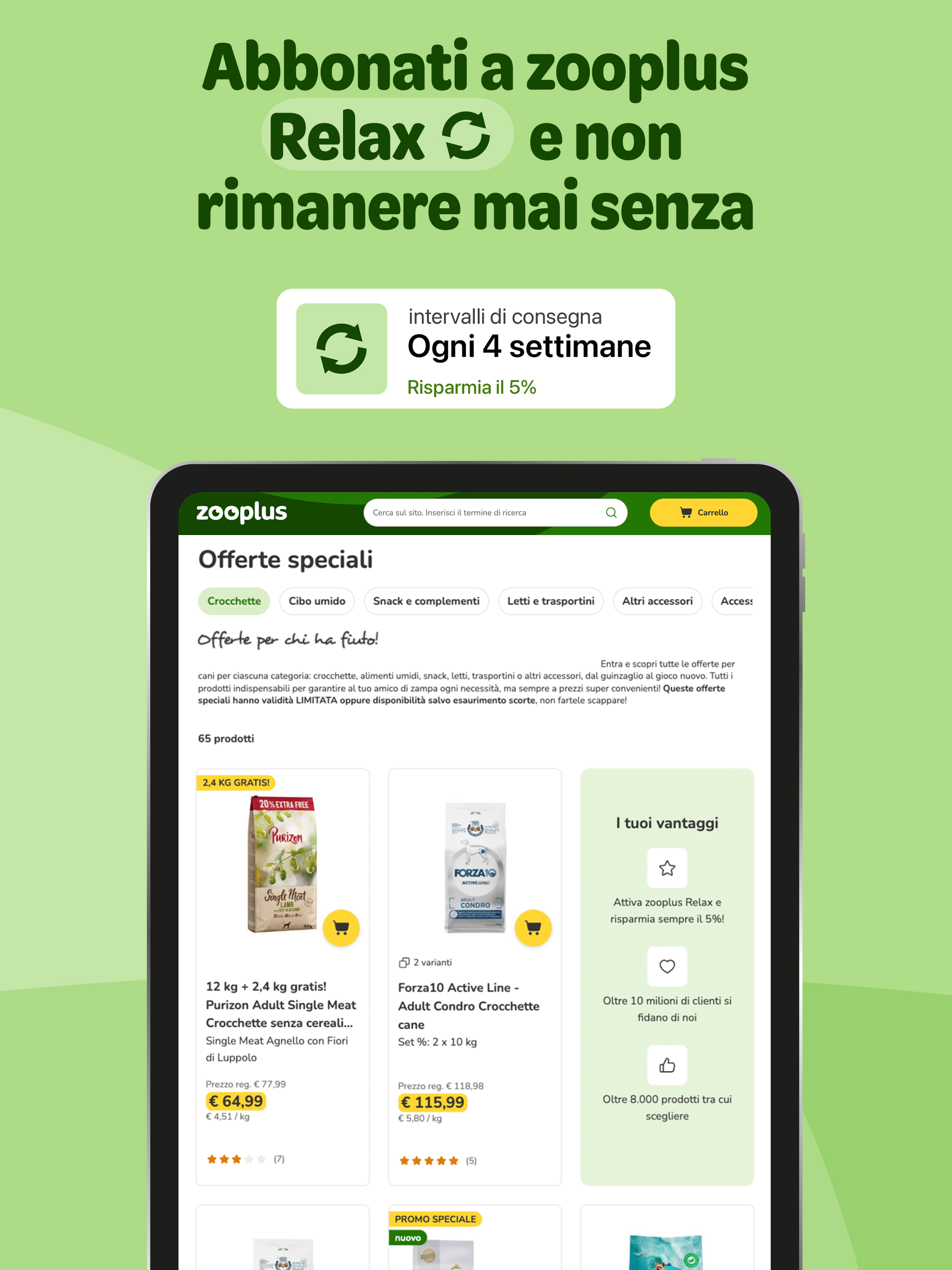 Attiva l’abbonamento zooplus e ricevi automaticamente cibo per animali e altri prodotti essenziali direttamente a casa, risparmiando tempo e denaro con i migliori marchi come Purina, Cat Chow, Pedigree, Royal Canin, Friskies, Monge e Whiskas.