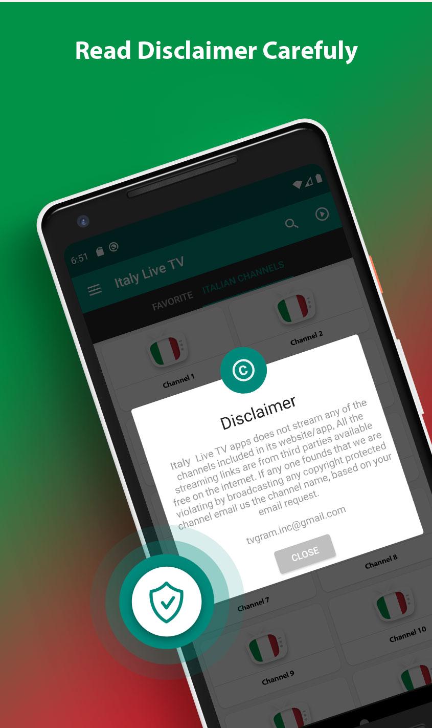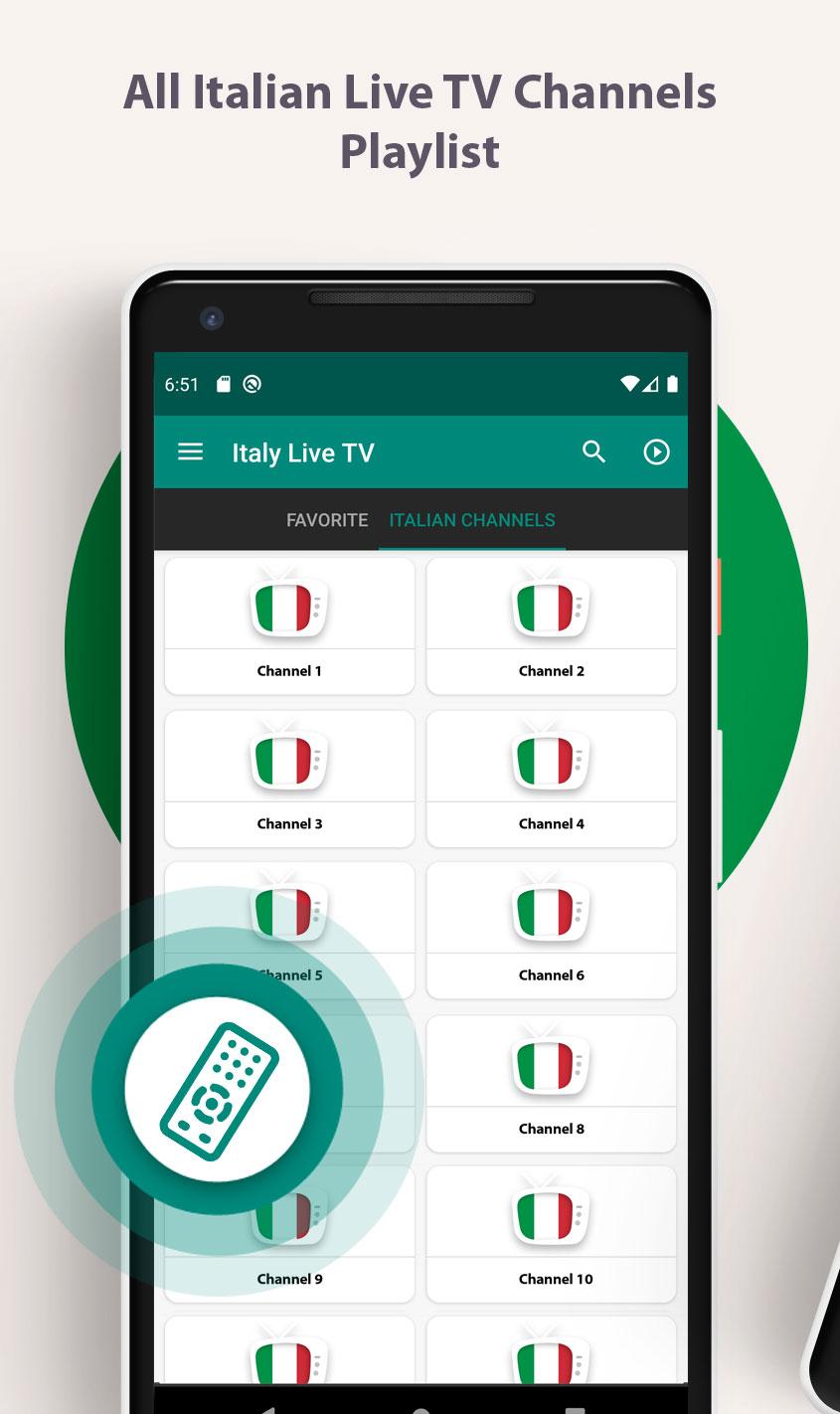 Italian - Live TV is an application that allows you to watch all world live Sports, Dramas, Shows, Entertainment anytime and anywhere on any smart phone/mobile. Italian - Live TV app for watching Live TV Channels like On World's Most Popular app. • Live Sports (Live Cricket, Live Football, Live Racing, Live Entertainment Programs, Many More…) • Worlds Live Entertainment (Worldwide disease and issues, Politics, Debate shows…) • Entertainments (Music, Live Radio , Reality Shows and all District's Cities Local TV Channels) The continuous update of the list of stations will provide better quality and responsiveness to solve any problem. Requirements (wifi, Any from Jio Network, 3g, 4g, 5g and up …) Below The channels broadcasting that available in the app some channels may be temporarily unavailable: • Live Entertainment Channels (Hindi, English, Tamil, Italian, and Gujarati) • Live Sports Channels (Live Cricket, Live Football, Live Racing, Live Golf, Live Badminton) • Live Italian Music Channels • Live TV for Kids Channels • Live TV Italian Shows Channels More Live Channels… Features: • Chrome-cast Supports (You can watch live TV directly on your smart TV) • Other Player Supports (You can watch live channels to any your favorite player like (MX Player, VLC Player etc.)) • User Friendly UI Design and Full Screen Video Player with High quality streaming. DMCA Notice (Important): This application only contains 3rd party links Which are freely available on the World Wide Web. All content is copyright of the respective owners. Names of all entities and images are brand names and registered trademarks of respective entities. Use of them in this app does not imply any affiliation with or endorsement by the entity. Their use in the app is solely meant for information about services provided by them. The app facilitates and encourages using services provided by the entity for public use. The information provided in the app though is compiled with utmost care, the app cannot guarantee that this information is and stays 100% accurate. We therefore reserve all rights of the app and accept no liability for any kind of damage directly or indirectly that can come from the use or not able to use the information and functionality provided by the app. Developer is not responsible for the content used in the application. Please use the application at your own risk. We provide LINK to free to air TV channels only. If anyone wants to remove any channel from our platform means mail us.
