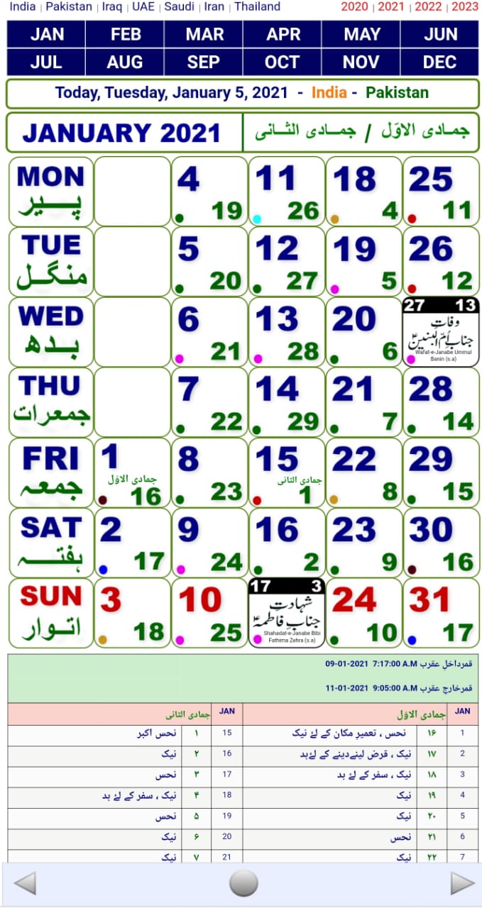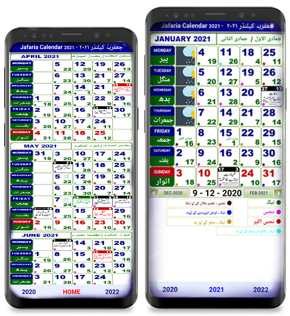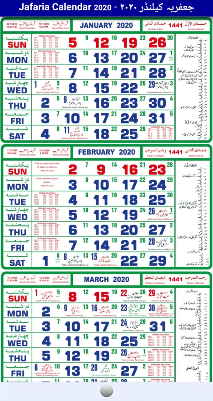 = JAFARIA CALENDAR 2021 = Islamic or Hijri calendar is a calendar consisting of 12 months in a year. It consists of 354 or 355 days. It is often used to determine the proper days of Islamic rituals. The current Islamic year in Hijri calendar is AH. There are twelve Islamic months; the names of Islamic months are Muhararam, Safar, Rabi al-awwal, Rabi at-thani, jumādá al-ūlá, Jumādá al-ākhirah, Rajab, Sha‘bān, Ramaḍān, Shawwāl, Dhū al-Qa‘dah, Dhū al-Ḥijjah. New Islamic year starts from the month of Muharram. Four months are considered sacred among the twelve months which are Muharram, Dhū al-Qa‘dah, Rajab and Dhu al-Ḥijjah. The length of an Islamic month depends upon the lunar cycle. Depending upon the visibility of moon each month can have 29 to 30 days. Islamic days of week start at sunset like those in the Hebrew and Bahá'í calendars. Friday in most of the Islamic countries is considered the day of rest. Muslims gather on this day and offer their Jumma Prayer. In Muslim countries like Egypt and Saudi Arabia Friday and Saturday are considered as official weekends. A few countries including Pakistan have chosen Saturday and Sunday as their official weekends keeping Friday as a working day. The tabular Islamic calendar is also an Islamic calendar which is not based upon astronomical calculation rather it is a rule-based variation Islamic calendar. It consists of 11 leap years of 355 days and 19 years of 354 days. = HAIDER TV NETWORK = Bismillah- Haider TV Network is a Delhi (India) based team enabling live religious broadcasts and streaming features across the world. Our main aim is to connect the Shia Muslim community like never before with Live broadcasts of religious lectures and functions from different cities of INDIA. Our main object is to spread the message of Ahlul Bait (AS) while providing connectivity and convenience. We have successfully covered from Delhi/NCR, Haryana, Punjab, Bihar, Uttarakhand, Kargil, Telangana, karnataka, Uttar Pradesh (Amroha, Naugawan, Aligarh, Cholas, Meerut, Dhaulri, Jogipura, Muzaffarnagar, Kairana, Agra, Ghaziabad, Badhoulipur and Bijnor) ALHUMDOLILLAH WE HAVE BEEN PROVIDING THIS SERVICE FREE OF COST (All Broadcasts must comply with Haider TV Network Policy) Please Subscribe to our Youtube Channel if you haven't Subscribed yet. Address- Dargah Shah-e-Mardan, Jor Bagh, New Delhi 110003, India. Contact- +91 8750947869 Request for Surah e Fateha Marhuma Akhtari Begum = JAFARIA DEENIYAT = Alhumdulillah, by the the grace of Allah subhanahu wa taa'la, JAFARIA DEENIYAT is pleased to announce the Deeniyat Syllabus Book store. The book store provides access to all the syllabus books which are used in Maktab course from Nursery to Advanced and Elders. These books are free to download and read as per your time and convenience. = JAFARIA AZAN = Listen to Shia Azan in your smartphones. In this app you can read and listen shia azan app . shia azan prayer and times provide many adhan with five best voices .this app has been designed for the people of FIQ-E-JAFARIA . =JAFARIA NAMAZ = If you are in search of accurate way of saying namaz according to fiqah jafriya then this app iis for you. With help of this app you can easily understand how to say Shia Namaz accurately. = JAFARIA CENSUS = This App is developed for Shia Data collection, validation and field supervision of Shai Census being conducted by Jafaria Team Members with customised login will be able to access the application for performing fieldwork.