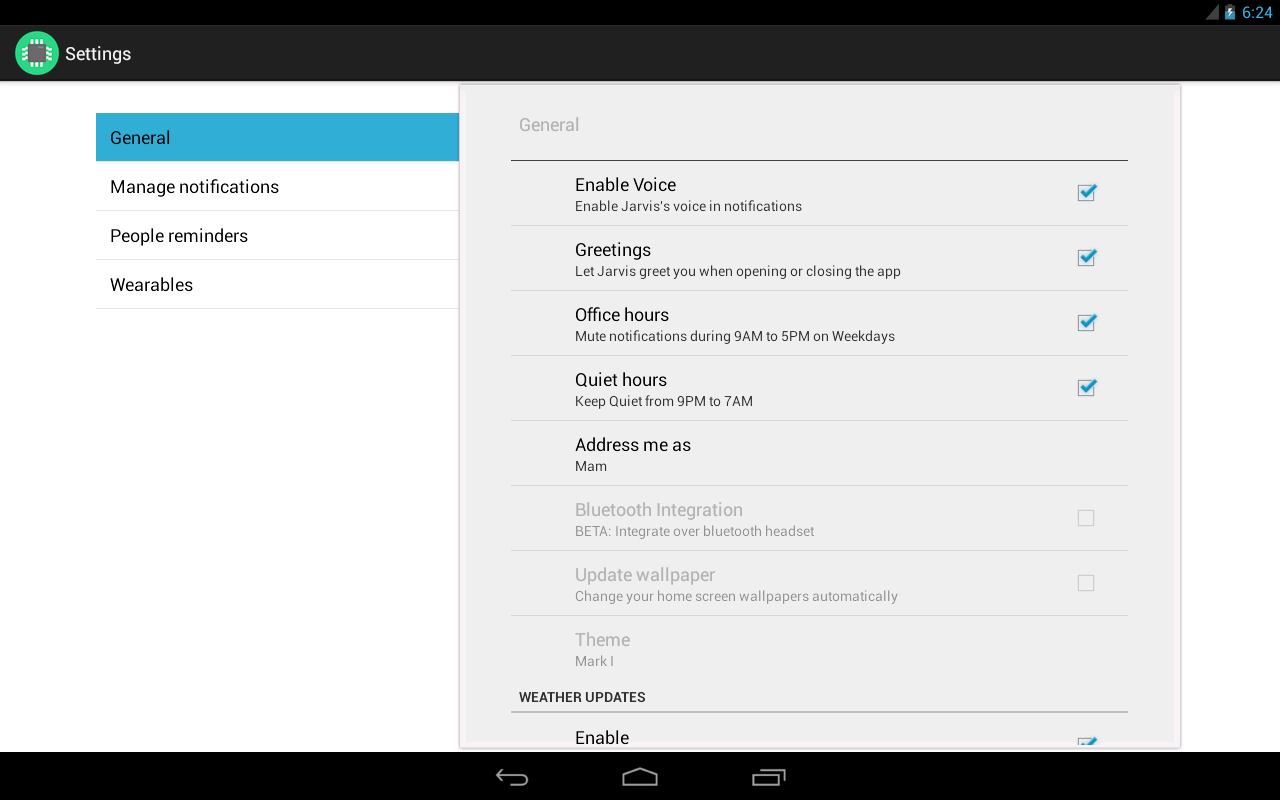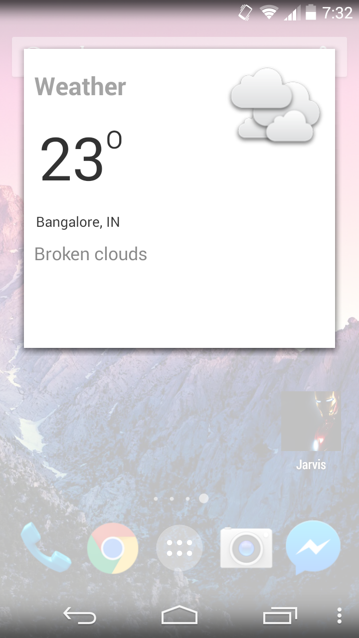 Jarvis is a one of a kind novelty personal assistant app with a cool factor like none other in the store, skyrocketing your phone's coolness factor to a whole new level. NOTE: Jarvis currently supports only English language. But don't get us wrong, Jarvis is more than just a show off, he can be your personal assistant keeping you informed about weather, news, calls, text messages and what more, control your phone settings like turning on WiFi, Flash, Bluetooth to name some, play songs over bluetooth, set reminders based on people. Jarvis adds a cool factor to every thing he does making you look awesome! Widget support Access Jarvis from your lock screen with a single tap. Save notes & access them with Notes widget. Wearable support Jarvis runs on your Android wearable as well. Ask him to play songs by name, update your phone's background, change phone's settings & the list goes on. WakeUp Alarms Use Jarvis to set quick wake up alarms, this couldn't get any easier. Calls & Messages Make calls & send text messages with Jarvis, all you have to do is just tell him. CloudVoice Dynamic conversations Jarvis is dynamic in conversation. He has a variety of answers for variety of questions & some of them are outright funny. If he doesn't know any, he learns them over time. Notifications Get voice notifications about weather, news, battery status & power levels. Automatic wallpaper update Jarvis can update your home screen wallpaper automatically almost every day keeping it refreshed. Theme support Customize the appearance of the app by selecting from Mark I, Mark II & Mark III themes. Device control Control your phone settings like Flash, WiFi etc People reminder A one of a kind reminder which allows you to link reminders to your contacts so you get reminded when you get or make a phone call. Media playback Play media by name, album, artist. Shuffle the list, play or stop. Bluetooth Support beta If your device is running JellyBean or up, you can use your bluetooth headset to control Jarvis, play media over it and do tons of other stuffs. This feature is still in beta so don't be alarmed if some bugs pop up. General searches Ask Jarvis general questions like "Who is the first president of USA", "How many meters are in a kilometer", "Convert 100 cm to inches" Office hours & Night mode It's always irritating when your phone notifies you something when you are in office or when you are home getting a good sleep. Jarvis understands that and has you covered with two modes, Office Mode & Quiet hours Contextually Aware Jarvis is contextually aware of time & device settings and he adapts himself based on when you wake him up. Easter eggs Apart from the regular chores, Jarvis tries his best to keep you entertained. There are some easter eggs hidden inside the app, see if you can uncover them. If you encounter any bugs or want to see a feature get implemented, please do write to us before giving a negative review. Privacy No contents of your phone ever leave the device to any server (except the speech recognition). Please Note: "Jarvis - My Personal Assistant" is in no way associated or endorsed with the actual character. ( Product Code: fd03e2cc6e )
