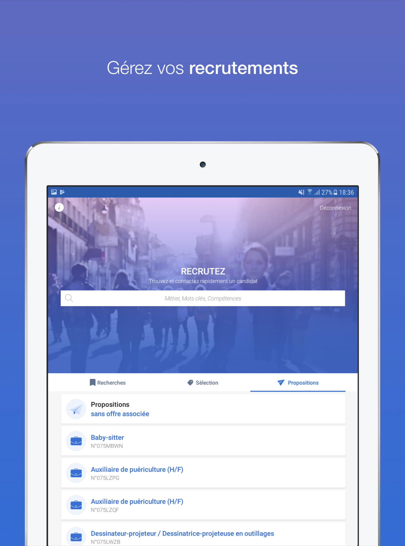 Recruiters, download the France Travail “Je Recrute” mobile application which allows you to find candidates from the largest database of profiles in France. Whatever your sector of activity, your location or the size of your company, in a few clicks, you can easily: