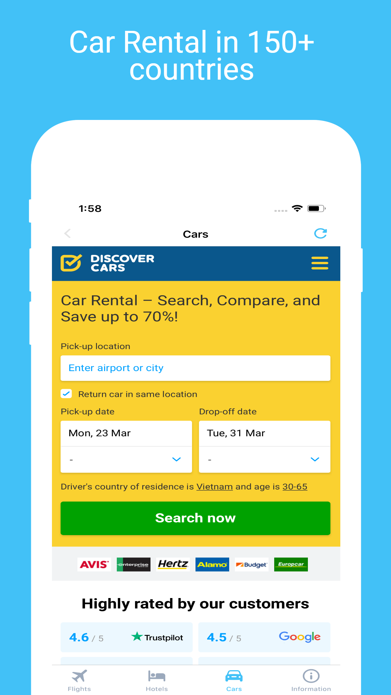 Jetgo is an application that helps you search for cheap airline tickets from more than 1,000 airlines and travel agents. We do not sell tickets, we help you find the best price for your trip. * FIND THE BEST PRICE FLIGHT Search and compare thousands of flights in one place. You only need to enter your travel dates and destinations, we will find the cheapest flights. If you are not ready to book a ticket, you can refer to the ticket price and come back anytime. * CHOOSE THE RIGHT HOTEL In addition to helping you find airline tickets, we also help you find accommodation. Compare prices of thousands of hotels, resorts, apartments and motels worldwide. Or find a room near your current location and hunt for last minute deals. * SELF-DRIVING CAR RENTAL Choose the time and location you need to rent a car, and we'll help you find deals. You can search by vehicle type, fuel type and features. You can rent a car in more than 150 countries. * * NO ADDED FEES We do not charge any extra fee from our app. It's free. Note: Use Jetgo to search for airline tickets, compare hotel rates for your trips. Do not forget to rate the application and share it with your friends.