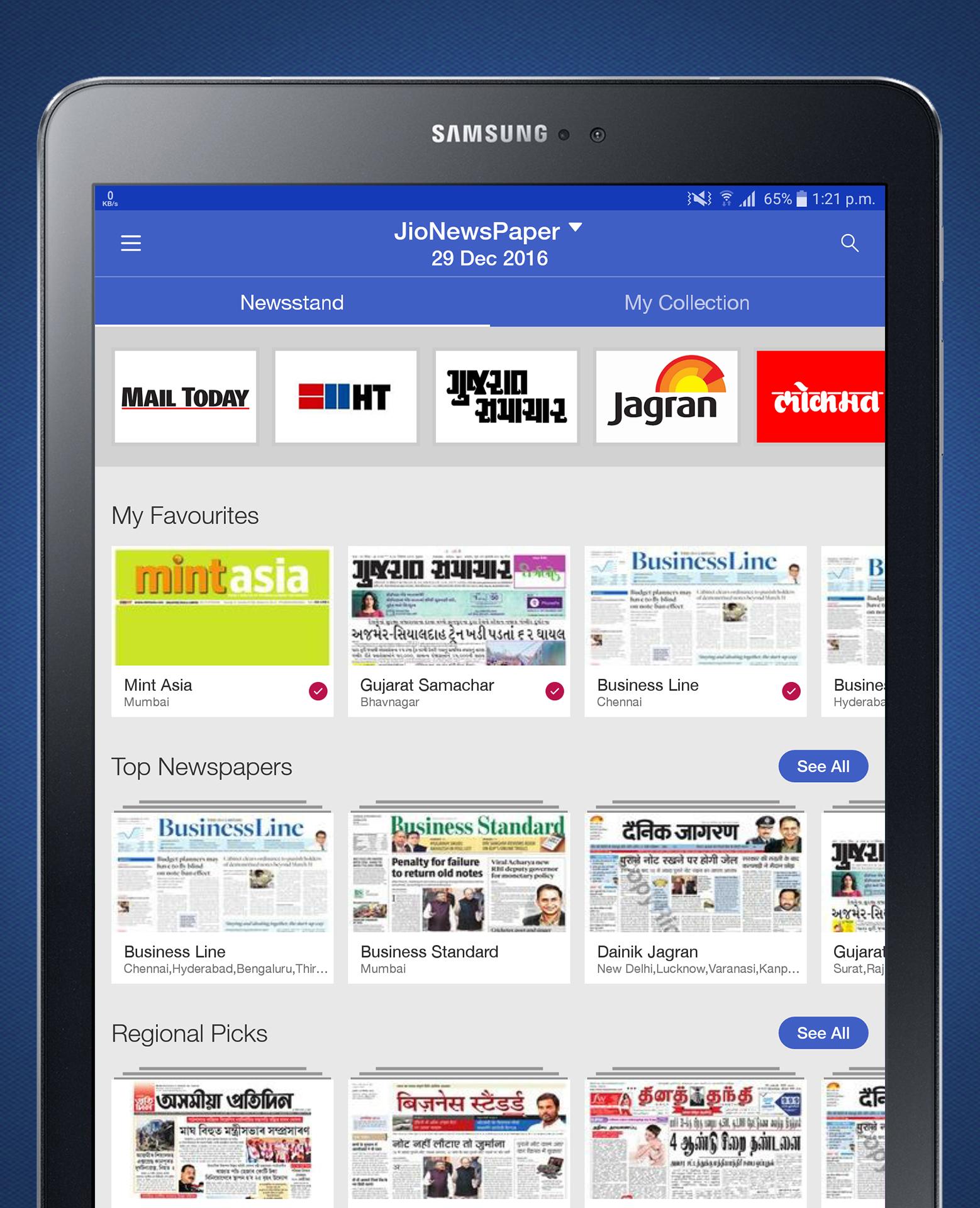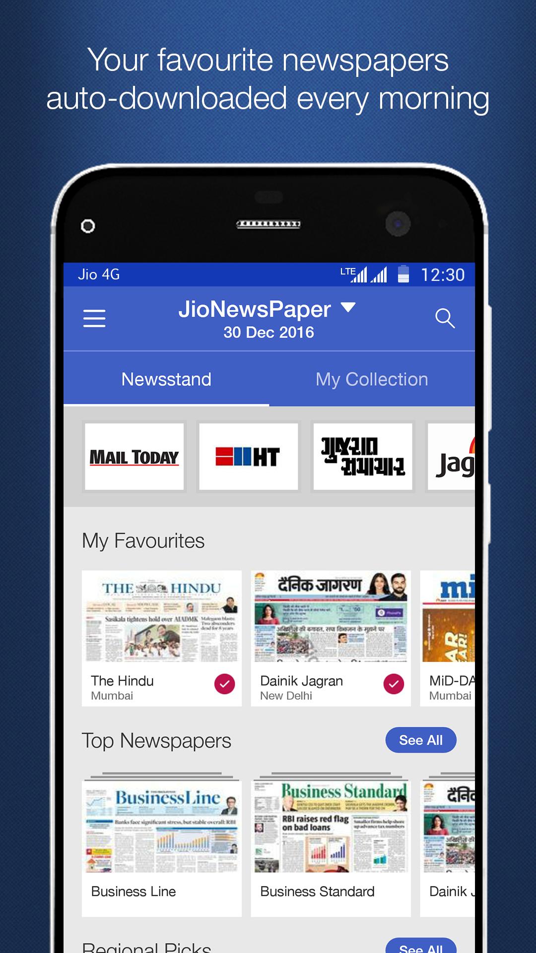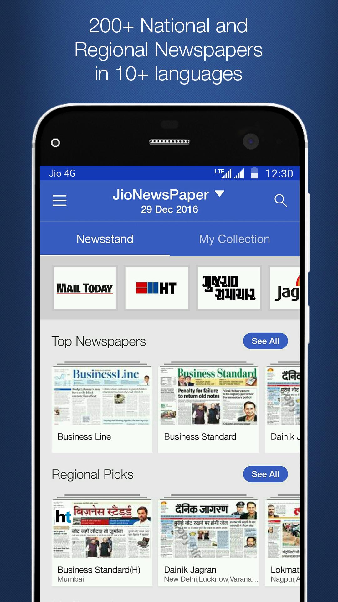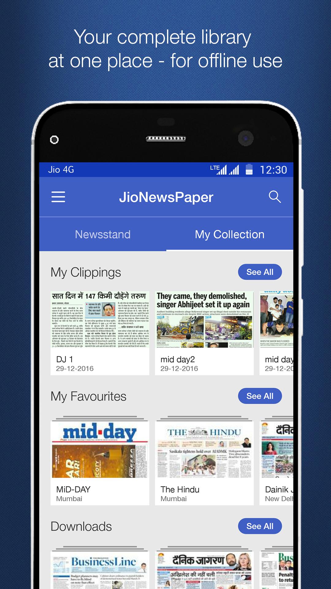 ***Exclusively for Jio SIM users***JioNewsPaper offers top national, regional and international newspapers in 10+ languages at no additional cost. With Jio NewsPaper, you can stay connected to news from your city even when you are away in your own language including English, Hindi, Tamil, Telugu, Kannada, Odia, Marathi, Urdu, Gujarati, and Assamese. With JioNewsPaper, Jio brings to you a superior reading experience mirroring print and ability to read the downloaded newspapers offline at any time convenient to you.