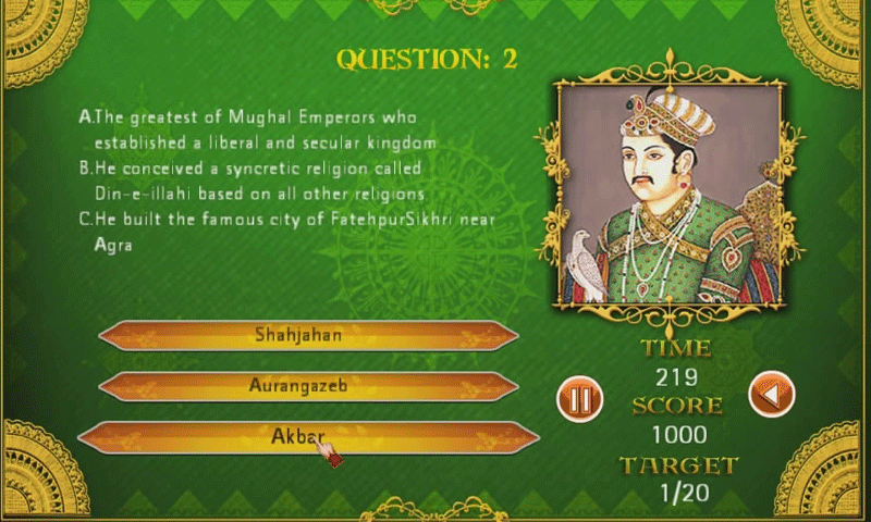 History goes digital. Zee TV brings to you a fun and educational game You can challenge your knowledge about the Mughal Empire through a quiz game - The Grand Entry. Test your reflexes as you race along the battle field combating the enemy in The Ride of your Life and The Battle Royale. The Hot Spot tests your observation skills. Fort Quest is a game that gives you a chance to become the great warrior Akbar and conquer the fort. With each threshold crossed in points your rank increases in the Mughal Army from Mansabdar to a Wazir to a Jawaan and finally cross a score of 1 lac points to gain the title of the Mughal Baashah and unlock a secret game The Nine Jewels. Each game tests your skill, knowledge, logic and game play like no other.