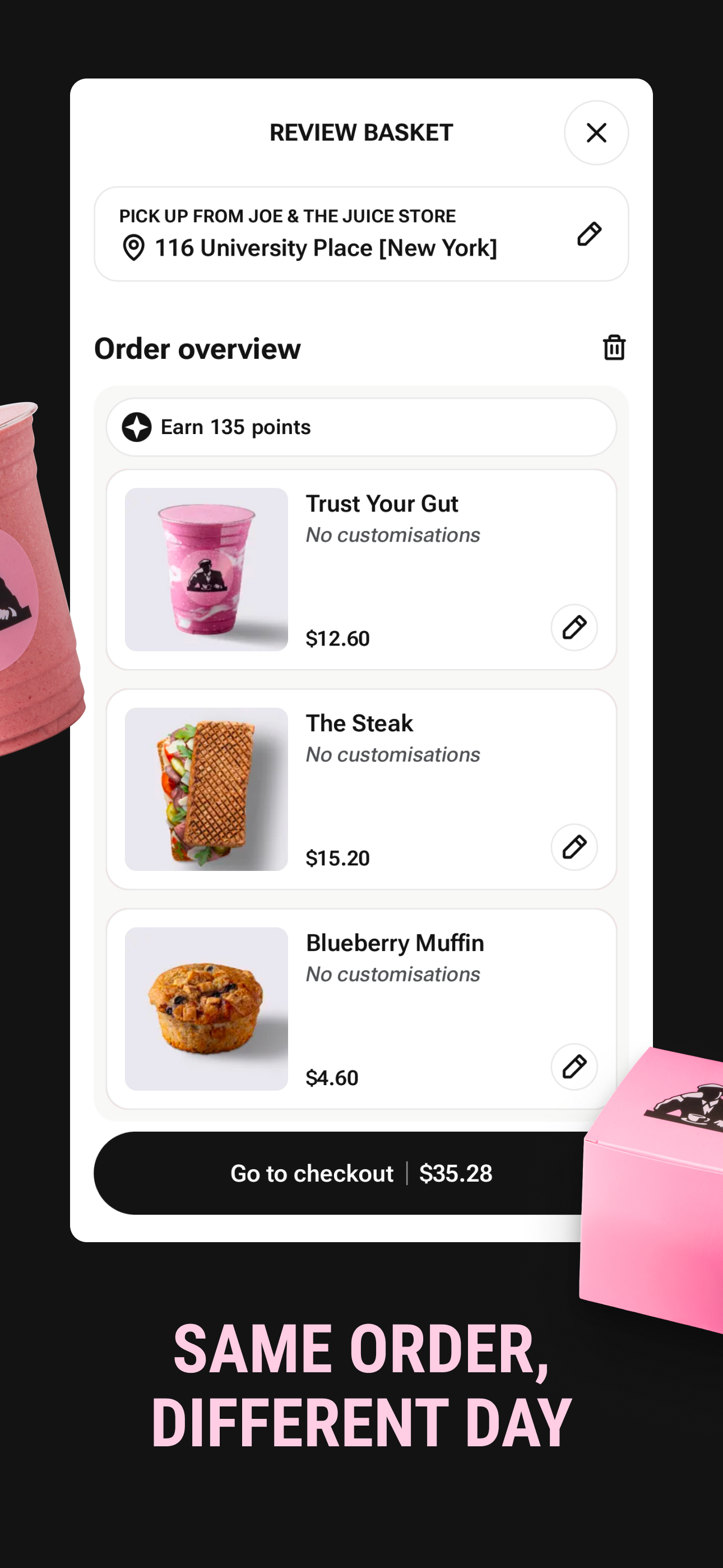 Use the JOE & THE JUICE app to order your favorite juice, coffee, sandwich, or smoothie, for pick-up or delivery, and earn points on every purchase with the new Loyalty Program. If you are a new app user, after your first app order, you'll receive a free coffee and enjoy 15% off for 30 days. Exclusion applies. T&Cs apply. Still not convinced? Here are more good reasons why you are going to love the JOE & THE JUICE app: PRE-ORDER: - Skip the line and save time! - Place an order in the app and it will be ready when you arrive, or choose an exact pick-up time. - Customize food and drinks to your dietary preferences. Gluten free sandwich? Acai bowl without granola? Protein or collagen in your iced matcha? The app makes it possible. - Track the progress of your order and receive a notification when it’s ready! LOYALTY PROGRAM & REWARDS Our new loyalty program gives you control into the way you get rewarded for your loyalty. - Earn points with every purchase made in the app or in store using scan to pay excluding purchases made with JOE Cards, Reward Cards and Campaign cards. - Exchange your points on your favorite juices, coffees and treats. - Complete fun in-app challenges to boost your points and unlock exclusive rewards. - Level up through the Loyalty Program. The more you order, the higher your level! Our Loyalty Program consists of 3 levels: - GREY: Welcome Reward after your first purchase (excluding counter products, shots and water). Your journey begins here. - YELLOW: Order 15 items per year and level up to Joe Member status. Earn +10% more points on every purchase. - PINK: Order 50 items per year and unlock exclusive rewards you won’t find anywhere else. Earn +20% more points, plus even more treats, surprise campaigns and more. DELIVERY Need your brewed espresso, tropical smoothie, breakfast bundle, or sandwich delivered straight to your door? Say no more! Use Deliveroo, or order directly through the JOE app so you don’t miss out on any points. WAIT, THERE’S MORE. USE THE APP TO: - Find the nearest JOE & THE JUICE location. - Scan for points when you order food and drinks at the counter. - Reorder your favorite food and drinks with two taps. That best smoothie on the planet. Or sweet green salad. - Receive special JOE coffee and juice offers before everyone else. - View allergens, nutrition, and calories for each food and drink product. Gluten? Vegan? Specialty coffee order? The app has your back with whatever makes you feel good and healthy. If you have any questions or feedback, you can contact customer service in the app. For more juice, smoothie, coffee, and fast delivery, find us on Instagram @joeandthejuice or visit www.joejuice.com