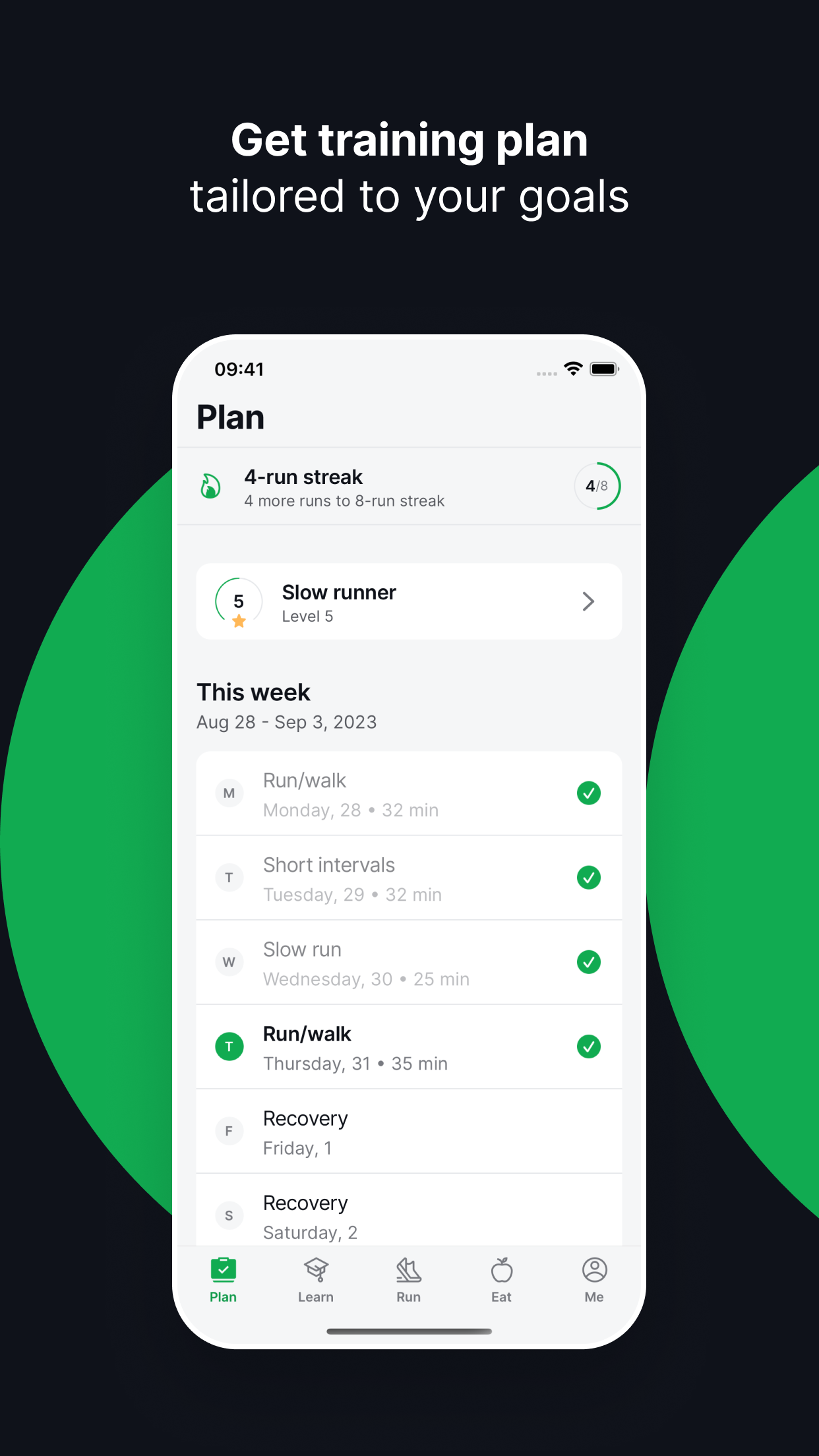Joggo is a running app for beginners and pros alike – great for both outdoor and treadmill training. With a personalized running program, custom meal plan, and a convenient running tracker, you can reach your fitness and weight loss goals in a way that works for you. Think of us as your personal running coach, your nutritionist, and your support group – right in your pocket. Created by elite coaches. Tailored to your goals. So it simply sticks. JOGGO FEATURES PERSONALIZED RUNNING PROGRAM FOR BEGINNERS AND PROS Take our in-app quiz, complete a short assessment run, and get a fully personalized training plan tailored to your needs, goals, and lifestyle. Whether you’re running for weight loss, training for a couch to 5K race, or trying to reach a new personal best – we’ve got your back. TREADMILL MODE If you’re not a fan of outdoor running or the weather simply sucks, you can train from the comfort of your own home – anyday, anytime. BY-WEEKLY PLAN ADJUSTMENTS BASED ON PROGRESS AND FEEDBACK Just like a real-life coach, we’ll evaluate your results every two weeks and adjust your plan’s intensity based on your progress and feedback. So you can work towards your fitness goals at a pace that’s right for you. TIME EDUCATIONAL BITS AND ALL-ROUND GUIDANCE From nutrition and injury prevention to breathing techniques and more – enjoy a library of educational articles and tips, custom-curated for you. So you have all the guidance you need, right when you need it. REWARDS FOR YOUR EFFORT TO KEEP MOTIVATION HIGH Earn digital medals for every running streak that you successfully complete – so you stay consistent, accountable, and on track with your goals. APPLE WATCH INTEGRATION Leave your phone at home and easily track your runs with the Joggo app on your Apple Watch. HRZ GUIDANCE WITH APPLE WATCH Install the Joggo app on your Apple Watch to track your heart rate as you run – so you know exactly when to slow down or speed up for best results. PERSONALIZED MEAL PLAN BASED ON FOODS YOU LOVE Get a custom meal plan tailored to your food preferences and dietary requirements – so you get the body and health you want without cutting the food and lifestyle you love. TIMELY REMINDERS Get reminders about your next run and new content in the Joggo app so you can easily stay on track with your goals. RUNNING AND WEIGHT LOSS TRACKER Our app offers GPS and distance tracking, speed monitoring, and activity history so you can always keep tabs on your running progress. And our weight loss tracker assists you in weight control and helps you reach your weight goal faster. With additional purchase: WORKOUT PLAN: Get a full-body workout plan with video tutorials and detailed instructions for your lower body, upper body, and core. Created by our top sports specialists. Joggo works with Apple Health to sync workouts data. DISCLAIMER: Please seek a doctor’s advice in addition to using this app and before making any medical decisions. Privacy policy: https://joggo.run/en/data-protection-policy/ General conditions: https://joggo.run/en/general-conditions