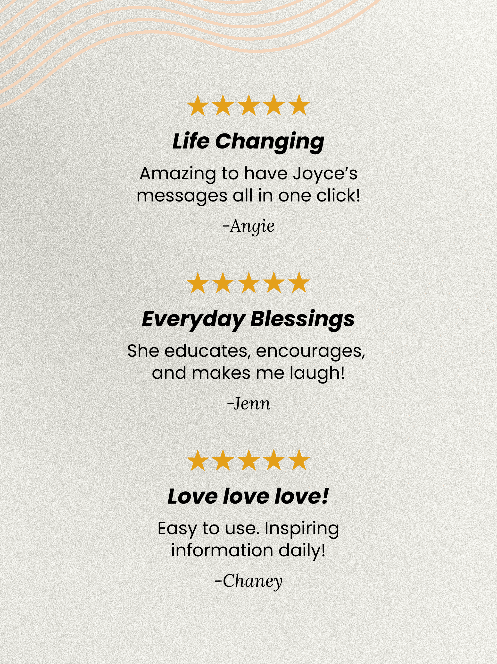 Carry Hope Wherever You Go The Joyce Meyer Ministries app—your go-to source for encouragement, no matter where life takes you. Here’s what you’ll enjoy: * Watch the Enjoying Everyday Life TV show every day and easily cast the show to your smart TV. * Read today’s devotion for a fresh word of hope * Access your personal library to listen or read powerful teachings * Get the answer to today’s Question of the Day * View the event list where you can see Joyce live * Add an app widget directly to your mobile device for quick access to the daily show and devotional * Be the first to hear about special offers, ministry updates, and news from JMM and Hand of Hope The Joyce Meyer Ministries app makes it easier than ever to experience Joyce’s teachings—at home or on the go. With fresh content daily and exclusive early access to some programs, you’ll always have something new to lift your spirit. Download the official app today and start enjoying everyday life—wherever you are.