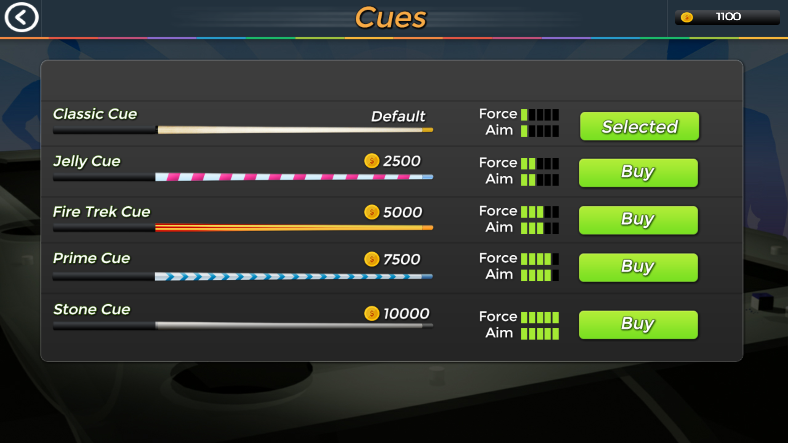 あなたはゲームショップで多くのものをアップグレード/購入することができます。あなたのキューの色をアップグレードすることができます&また、あなたは、その目的の精度とショットのパワーをアップグレードすることができます。あなたがお好みのテーブルの色を変更&また、お好みのロゴを選択することができます。あなたの友人や他のゲームのプレイヤーと通信するために追加のチャットパックを購入することができます。