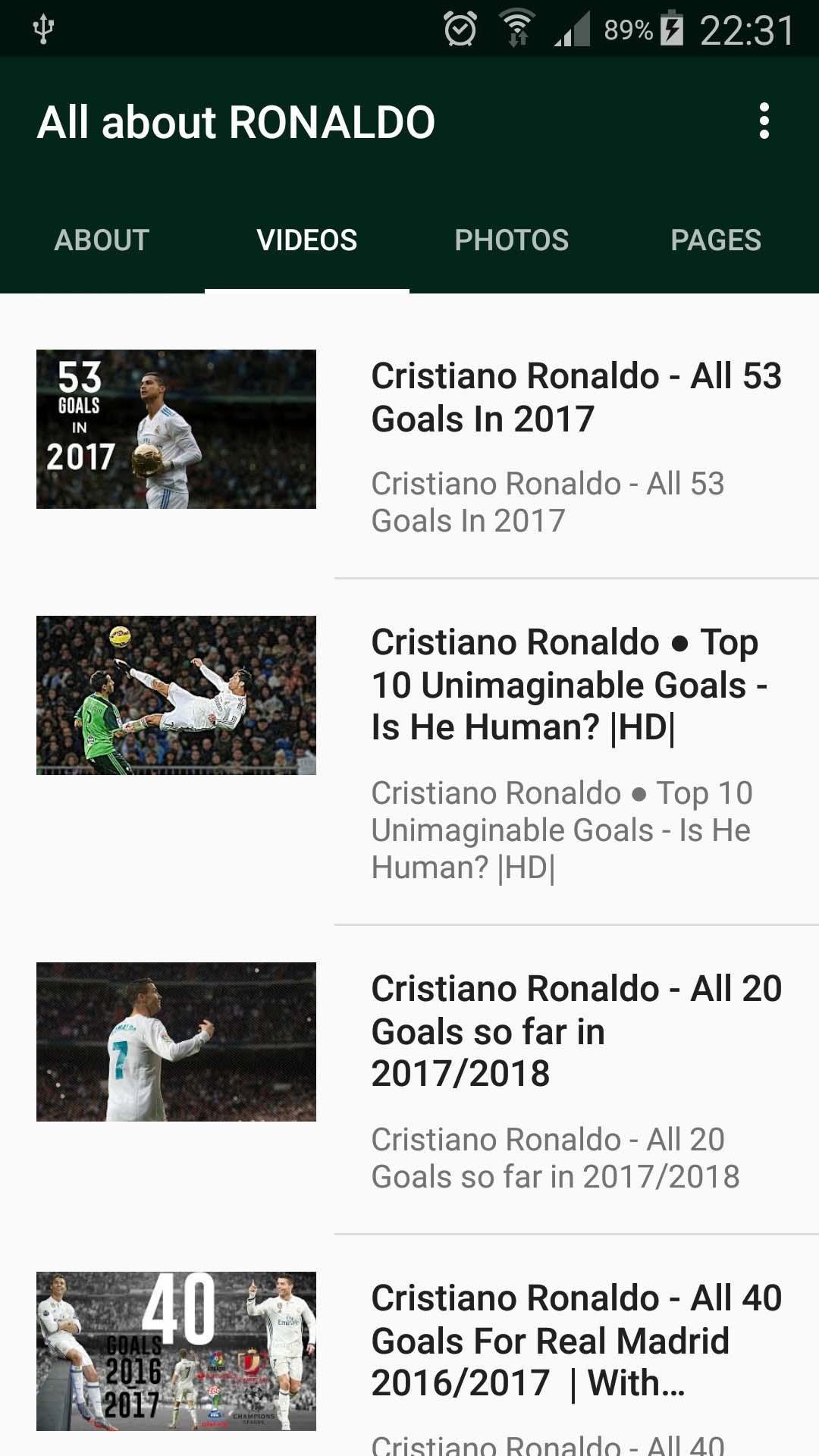 • Collection of most viewed videos on YouTube (hight quality): Skills and goals, Champions League 2017, 400 goals for Real Madrid, 600 goals in career, 118 goals for Manchester United, 5th Golden Ball.