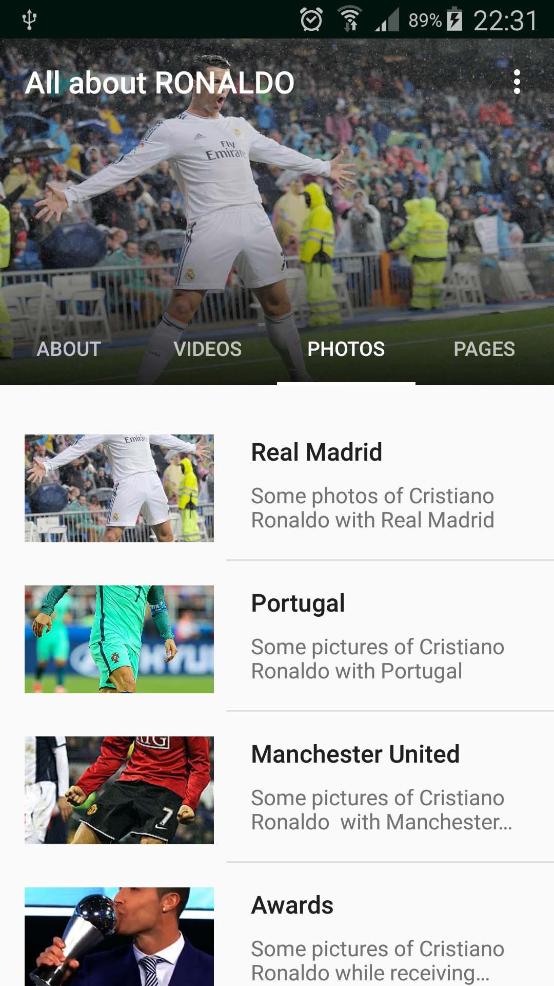 • A collection of photos (hight quality) with Manchester United, Real Madrid, Portugal, Familly and when he receives awards.