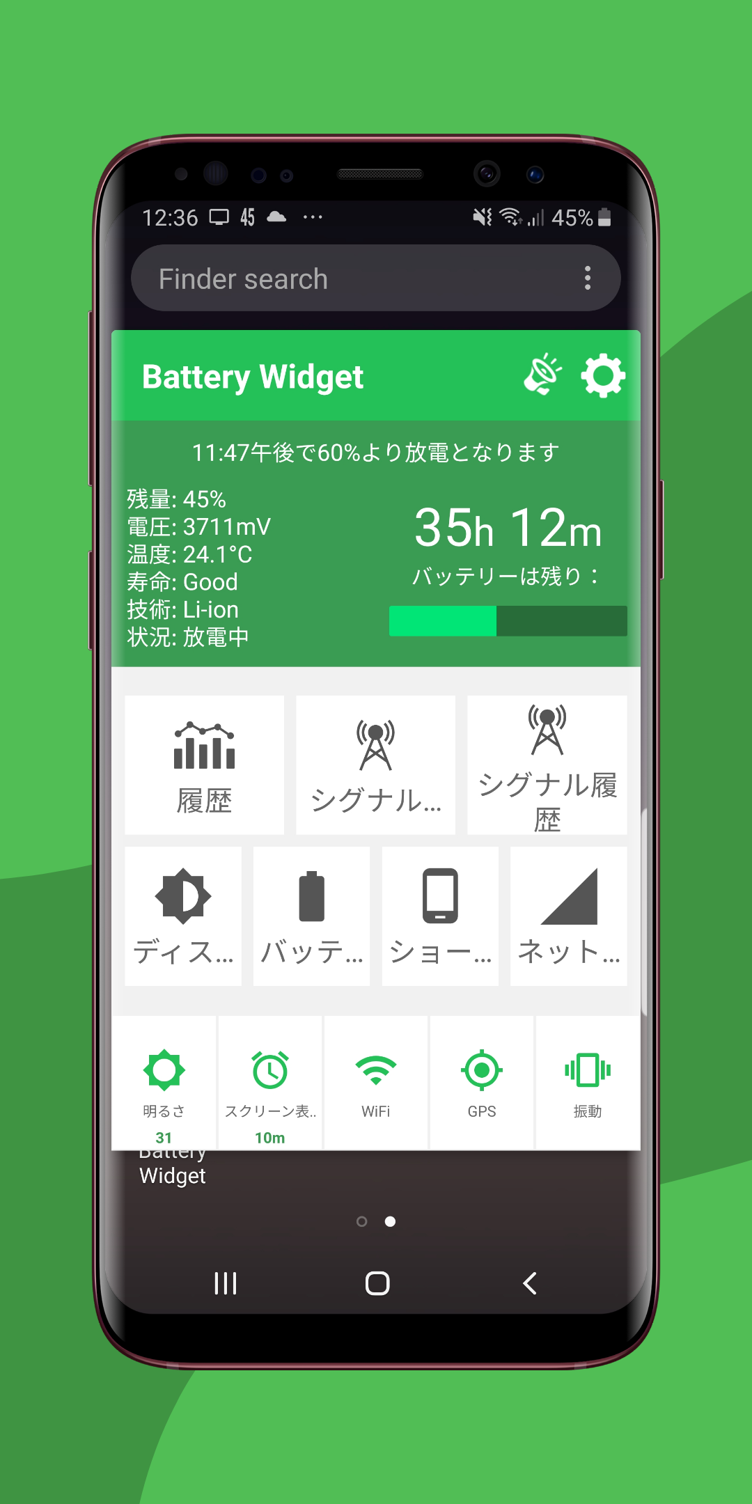 ライブバッテリーウィジェットはバッテリーのパーセントインジケーターを1 x 1のスペース内で表示します。最善シグナルファインダーマップは、弱い信号によってバッテリー消費が増える場所を示します。