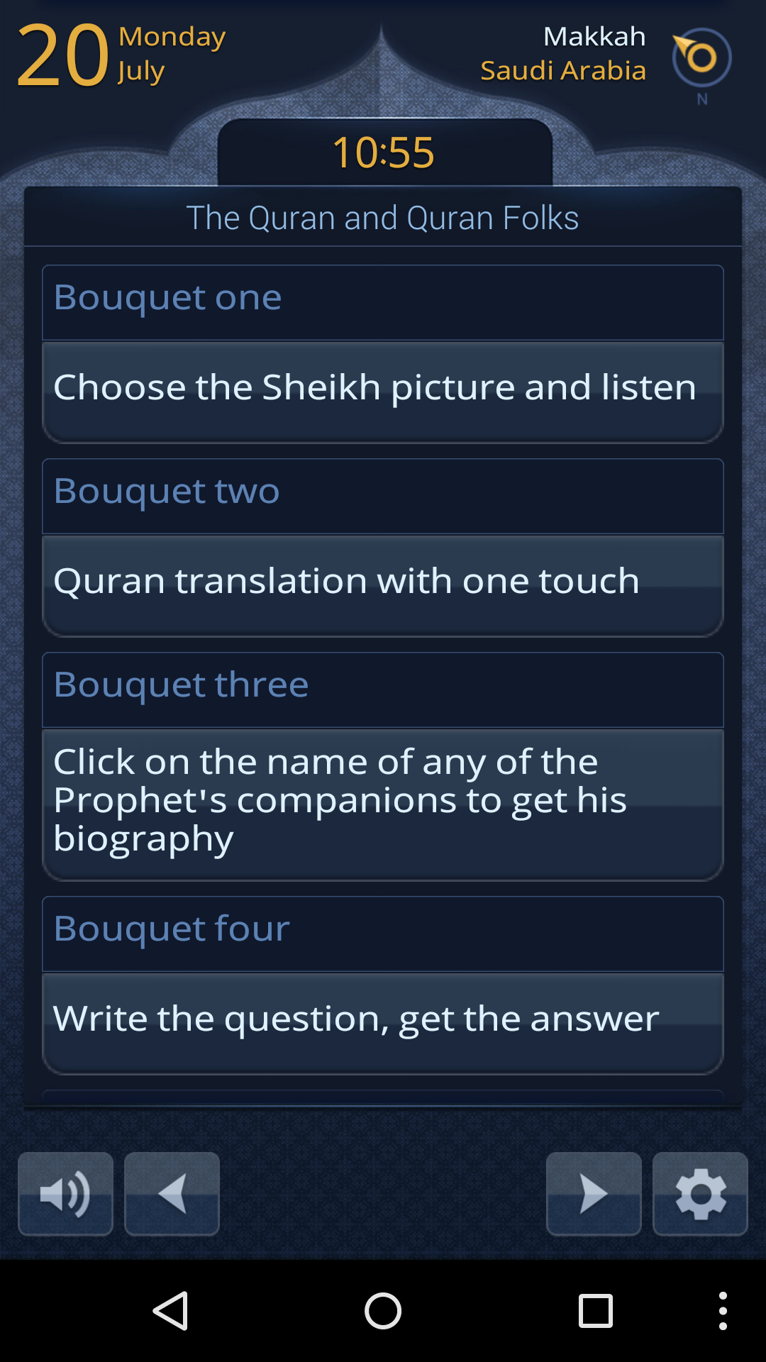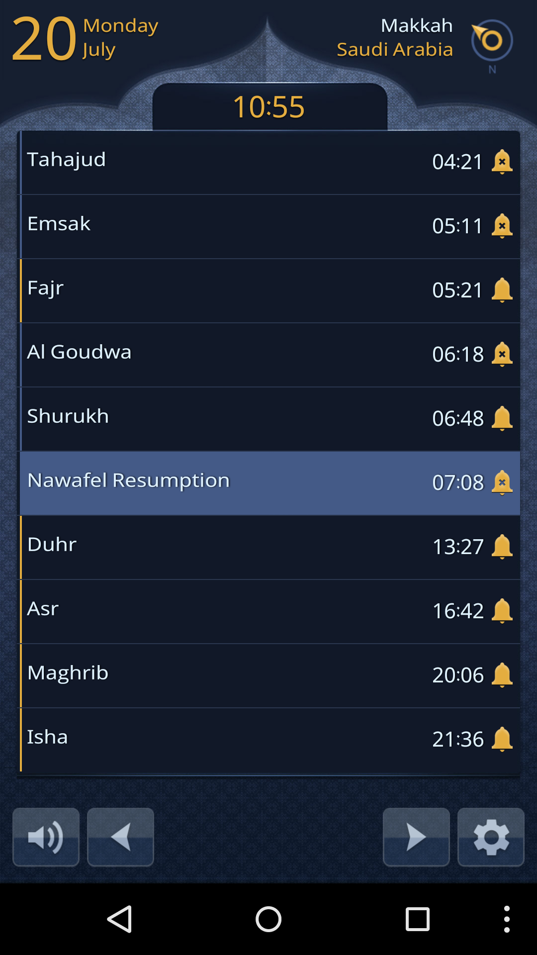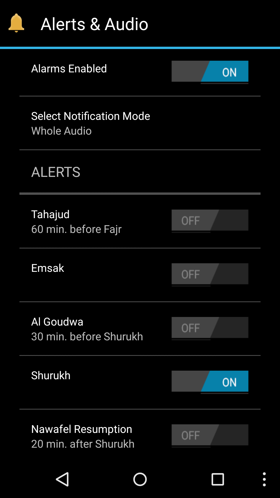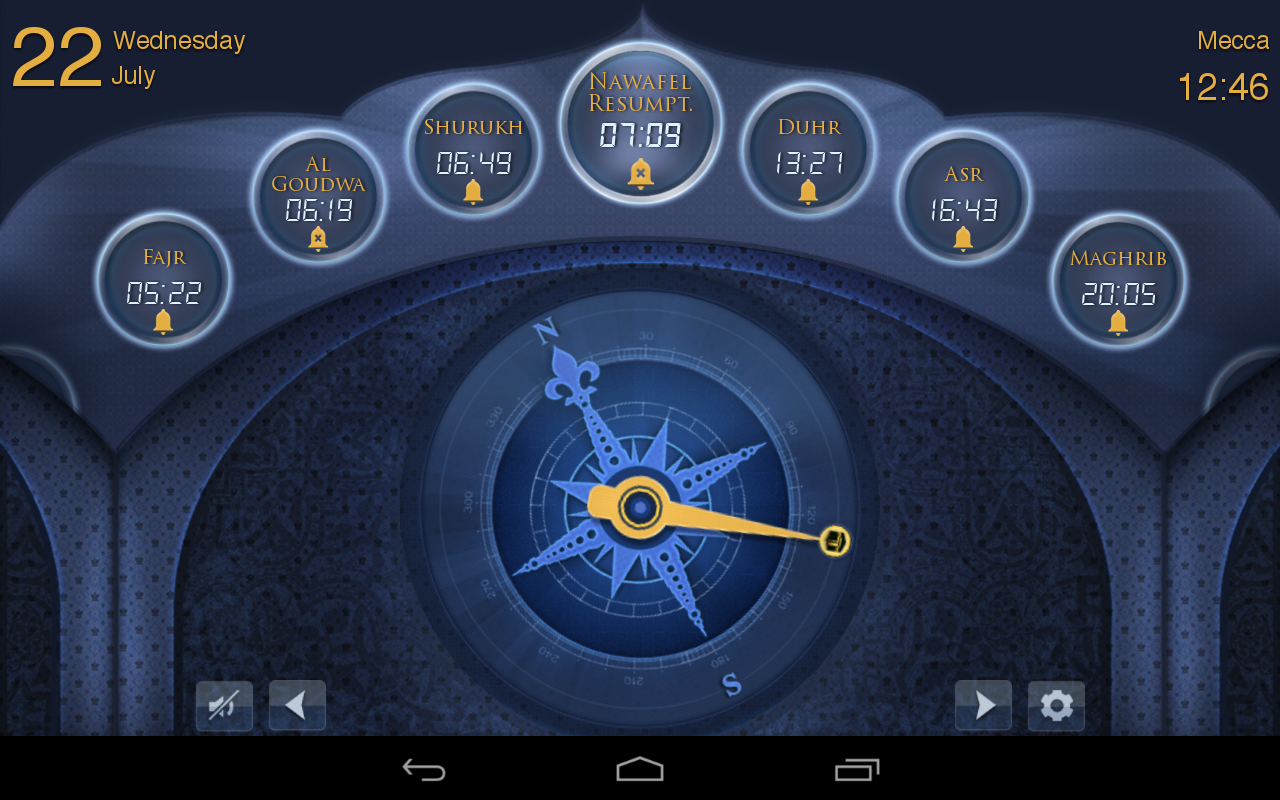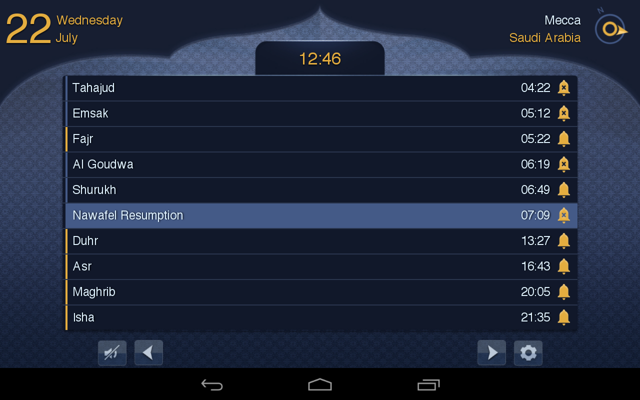 * Special prayer-related alerts (Tahajud, Al Gouwda and Emsak) with recitation of relevant verses from the Holy Quran