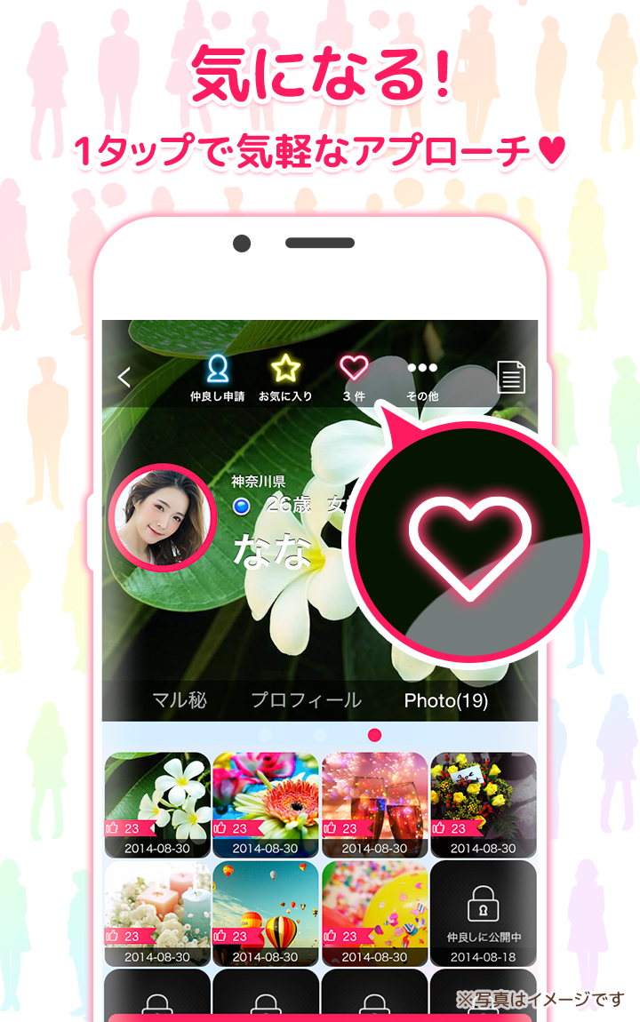 異性がランダムで表示されるので、素敵な人が見つかったら気になるボタンを押して