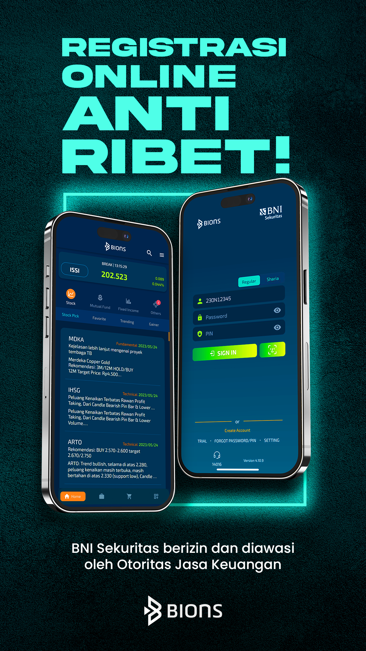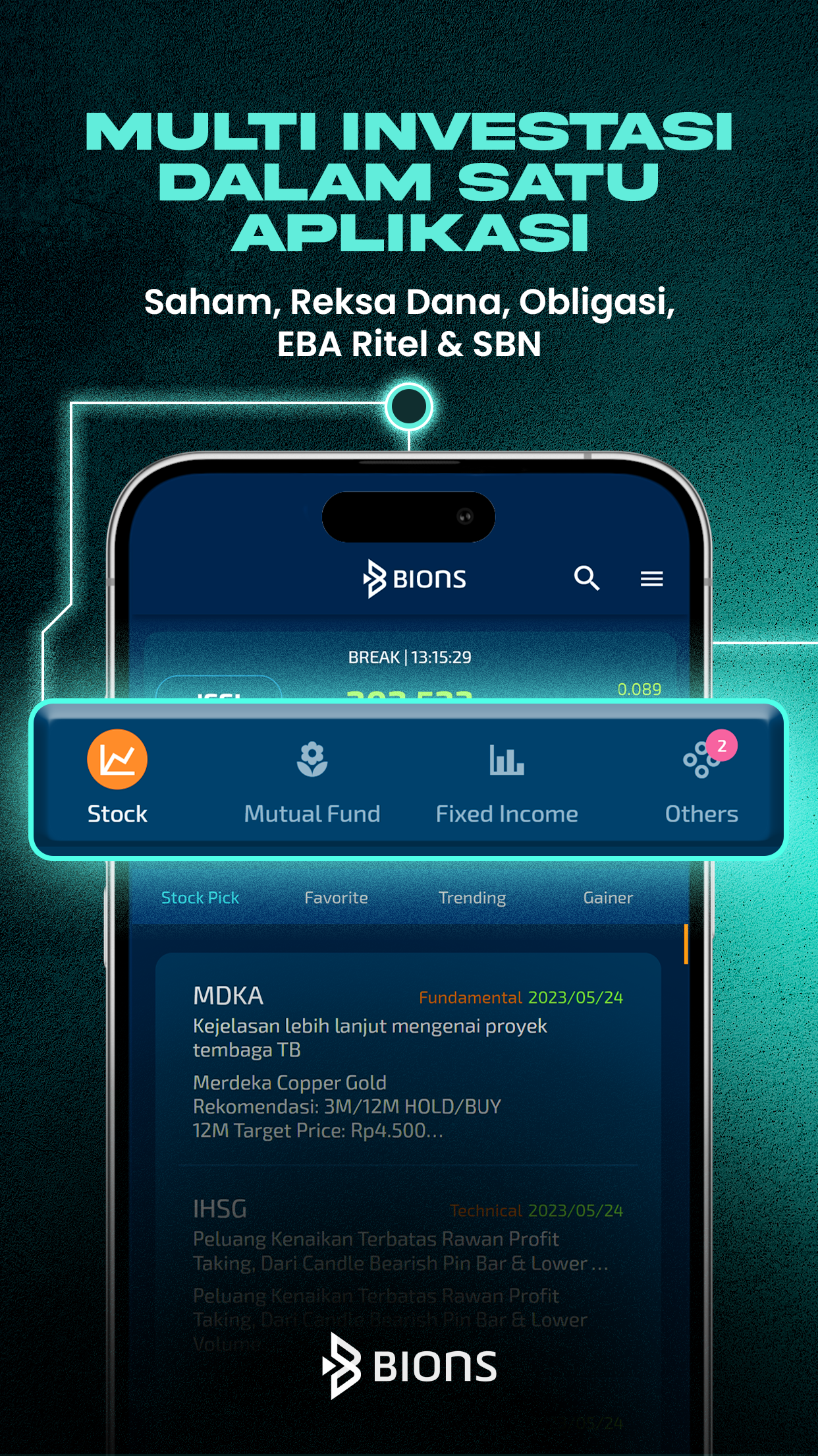 BIONS(BNI Sekuritas Innovative Online Trading System)は、株式、投資信託、債券(プライマリーマーケット)、リテールEBA、SBN(政府証券)への投資など、さまざまな投資商品の取引を簡単にするマルチ投資プラットフォームです。オンラインで、安全、簡単、信頼性の高い 1 つのリアルタイム アプリケーションで実行できます。