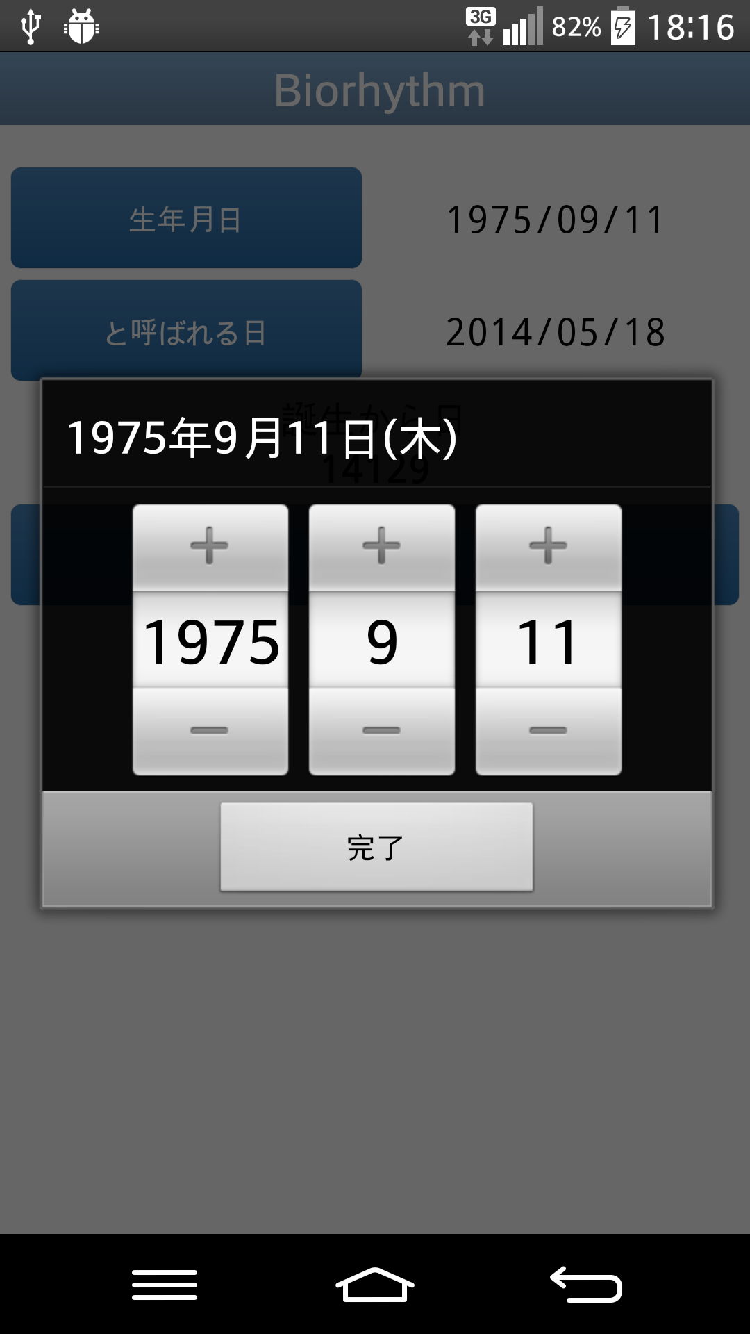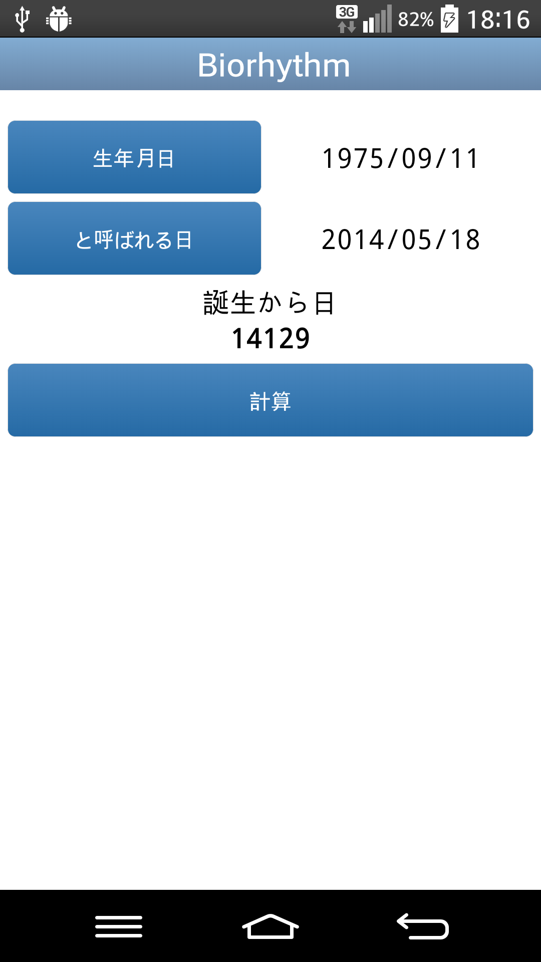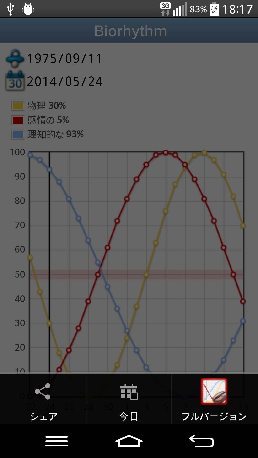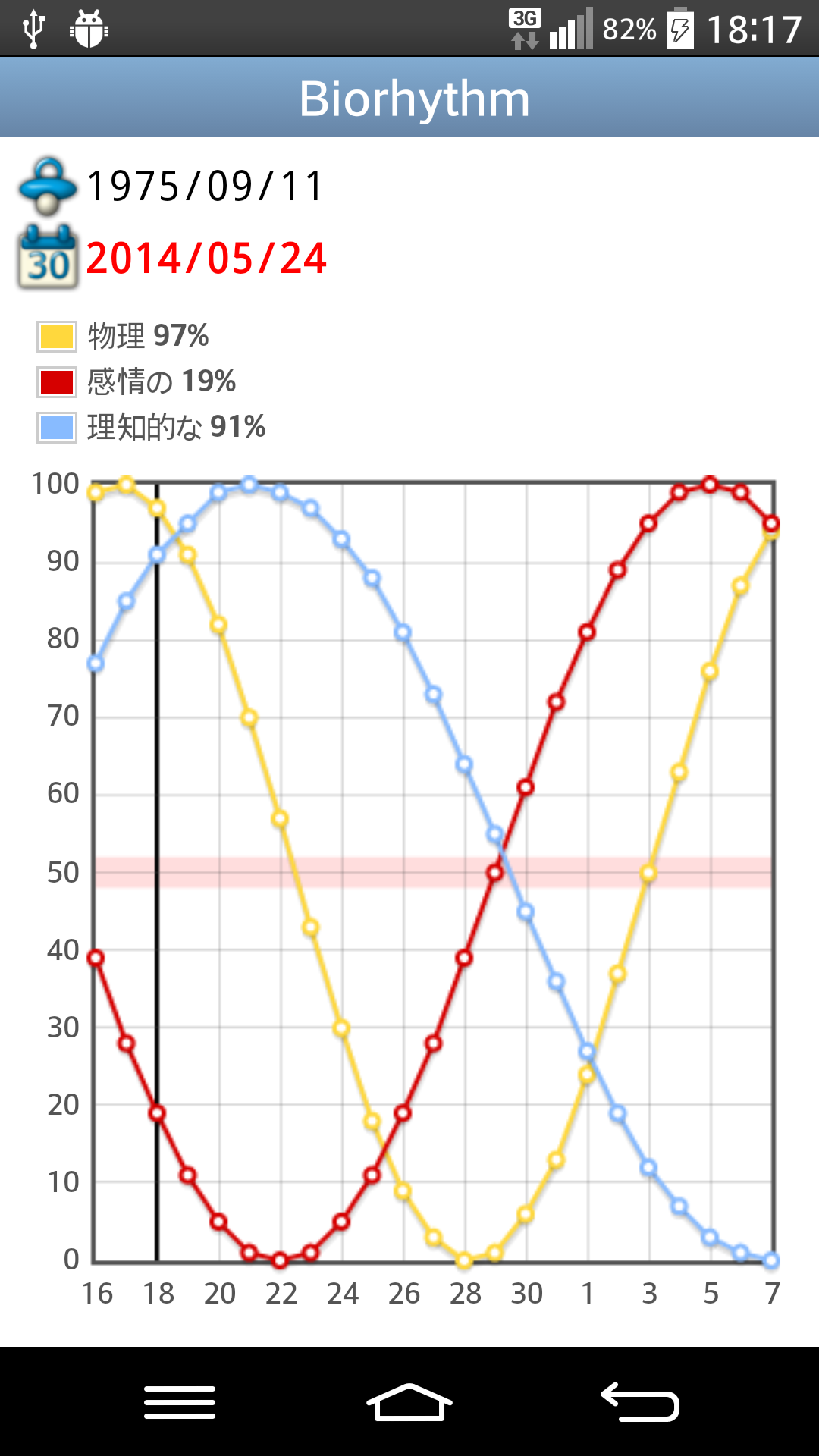 あなたの毎日のバイオリズムに目が離せない。このアプリケーションでは、毎日あなたのバイオリズムを追跡することができるようになります。アプリケーションは、出生日を元の物理的、感情的、知的あなたのサイクル、のパフォーマンス上で読みやすいグラフを描画します。 In some releases - for example Droid X2 - due to a choice of the smartphone producer, is not possible to select a birth date prior to 1st January 1970.