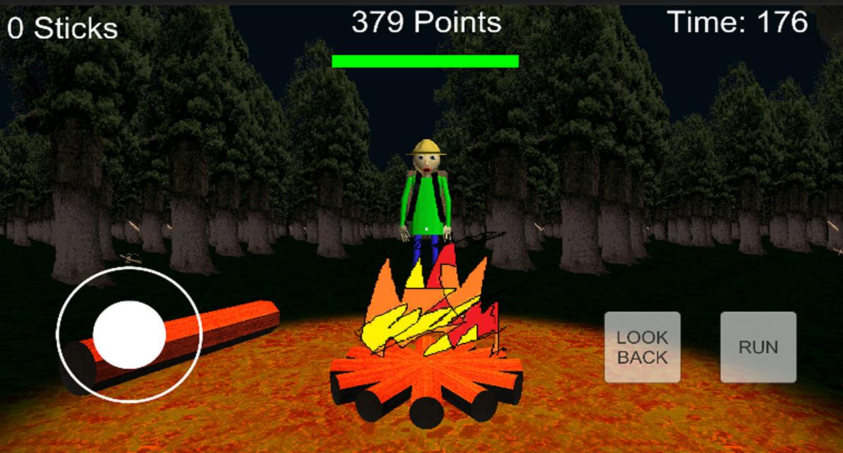 For a comfortable game, we recommend that you increase the brightness level to the maximum.*** Earlier, Baldi was at school and taught mathematics, now you have a trip to the Camping! Go to Camping with Baldi for fun! You are tired of studying and especially solve math problems from Baldi in notebooks! You came from Baldi basic to the forest to rest and fry the marshmallow. But the fire can go out. In order not anger Baldi basic , you need to collect the branches and throw them into the fire. Collect as many branches as possible to get a lot of bonuses! Be careful, Baldy is angry, otherwise he will overtake You and punish with a ruler! How long can you live, a day, two or five nights in a scary forest, where there's no one else besides you and Baldi basic ? In this field trip, you go camping with Baldis basic . Your goal is to keep the fire alive for three minutes. You can play it safe by throwing small amounts of firewood onto the fire, or you can take a riskier strategy by trying to gather a lot of pieces of firewood and throw them in all at once. Extra fuel gets converted into big points! You will have a limited amount of time, because you will be chased by Baldis basic , if the fire goes out, then it will be dark, scary and evil Baldy will catch up with you! You need to collect the branches in the camp so that the fire does not go out. For every time the fire goes out, an angry Bald'is basic can arrange a horror for you and if he finds you, then there will be no turning back. To survive more than five nights, you need to know all the basics of Bald'is basic in the camp.
