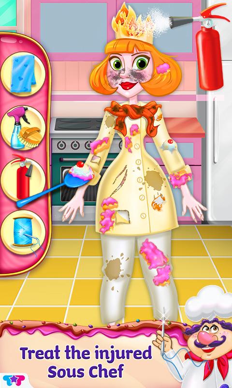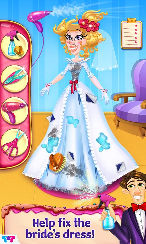Once you've treated the chef, you can continue on with your wedding day adventure. Head to the Chef's Kitchen where you will find an oven that has exploded. Use a fire extinguisher to put out the fire and rescue the sous-chef! Each stop along the way is a challenge to your skills. You’ll have to fix up the bride’s beautiful wedding dress, repair the wedding car, decorate the wedding cake, clean up the groom and so much more!