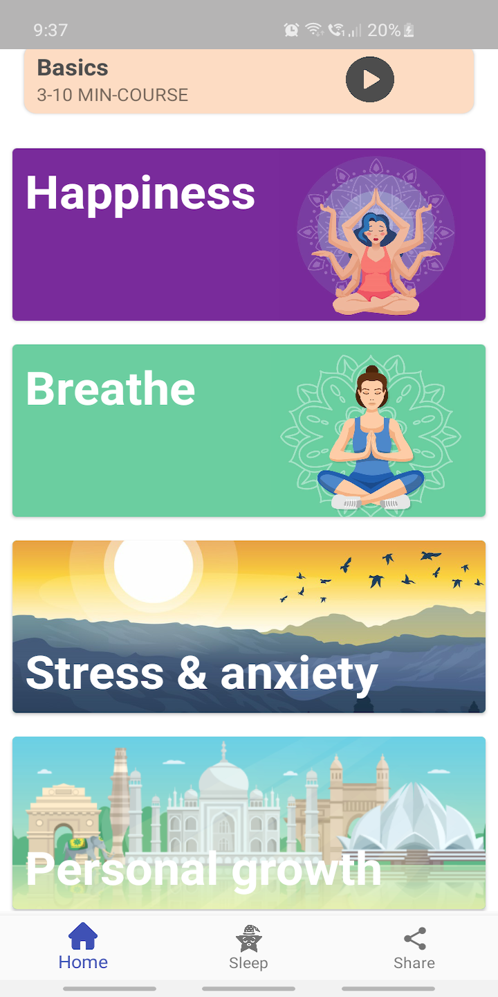 A sound mind is in a sound body With our lives running at speed of light we left behind our health in the rat race. There are various ways to get a fit body but there are very few to get a sound mind. If working out helps to improve your physical health, meditation helps in acheving the latter. With Yoga, we get both sound mind and sound body. Yoga has developed into a posture-based exercice and stress relieving technique. If you wish to steer your life with peace and improve your physical strength at same time, Yoga helps you acheive both. Daily Meditation app is the right choice to start your Yoga practise. With all the fundamentals, app is built for everyone who wants to take their first step. With several themes like if Happiness, Breathe, Stress&Anxiety and Personal Growth, you have the choice of selecting any and practise. Listen to our Yoga gurus and meditate easily with simple steps. Daily Meditation app helps you to achieve the serenity not just what you need but what you deserve Our app helps to take control of your life and enhances your personal growth. Beat the stress and anxiety easily with the instructions from the app. Daily Meditation doesn't stop just with Yoga but also offers wide range of solutions to get a better sleep. What does Daily Meditation app offer? Yoga and Meditation 1. Simple 3 Basics course of 3-10 min duration which help you to live happier and healither by learning the fundamentals of Yoga. 2. Themes that help you to -Acheive Happiness -Breathe with peace - Reduce your Stress and Anxiety -Helps to improve your Personal Growth Improve your Sleep: 1. Amazing Sleepcasts with dyanmic story telling in soothing voices. 2. Wind downs to improve your sleep by calming your mind. 3. Nighttime SOS with guided exercises for walking up in the night. 4. Lovely Sleep music melodies to make your sleep filled with calm and peace. 5. Sleep radio with 8 hours of recording to ensure you get enough deep sleep. 6. Soundscapes with recordings from all the amazing places around this world.