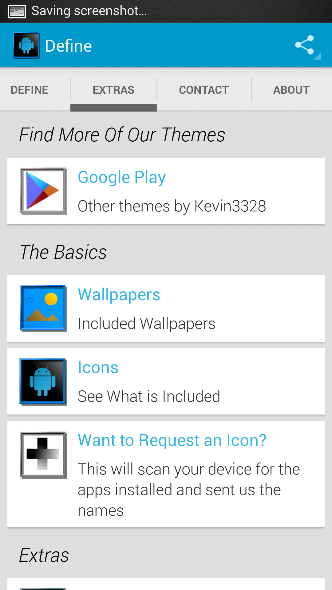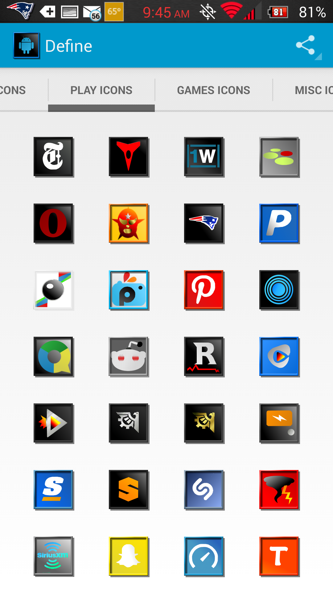 HUGE THANKS TO @jaithemes FOR THE NEW TEMPLATE HE MADE CREATING THE BEAUTIFUL EXPERIENCE THIS APP EMBODIES!! LOOK UP HIS WORK YOU WONT BE DISAPPOINTED!! Define Your Device with Define Icons a set of minimalistic styled icons with a frame to really make them pop on your screen. The set was handcrafted with the idea of creating a stock style look in true HD.. All icons are drawn at 144 x 144 pixels to give each icon a truly high defenition look!! Hope you enjoy!! ***Please Note*** This icon theme is for third party launchers including but not limited to Nova, Apex, ADW, Action, etc. This is a standalone app but will do nothing unless your home launcher supports themes Features -Icon mask is utilized to theme the icons not currently included to some exent - 475 custom HD icons and growing -Dashboard utility and icon picker capabiliies -7 custom made HD wallpapers included -Icon request utility ----> use it let me know what you want included -See whats included directly from the app -Misc system icons and appdrawers that you can apply -For Nova Launcher- comprehensive categorized organization of apps when manually applying Without further ado..Take a look at the screens and Define your device with a new fresh unique and truly high def look