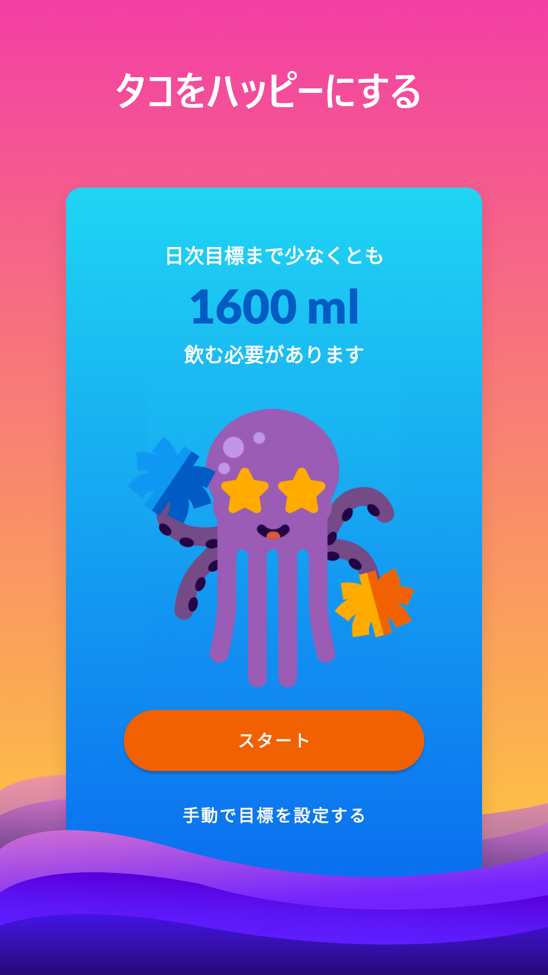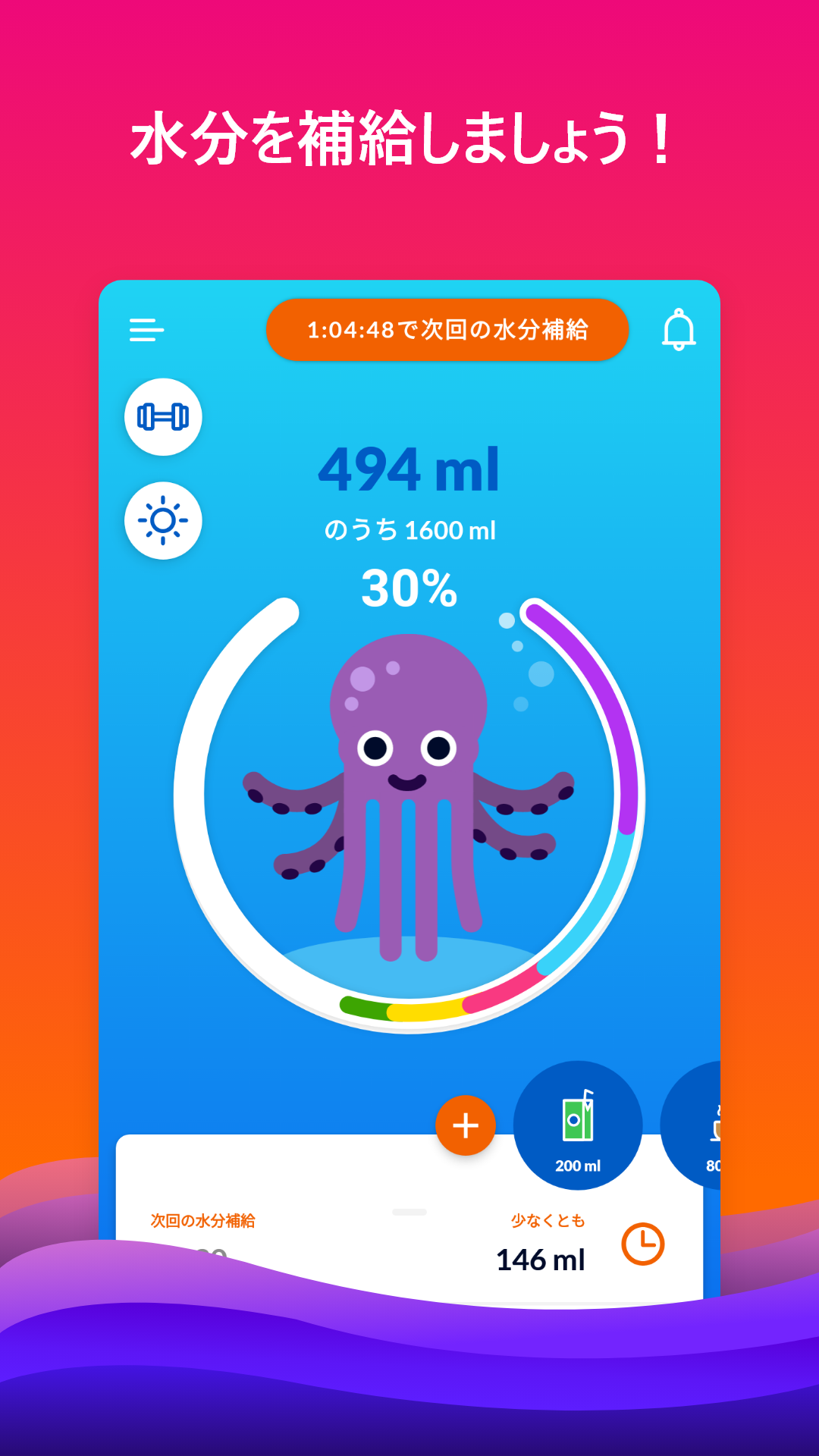 飲み物を飲んでかわいいタコをハッピーにしましょう。あなたが水分補給をサボってしまうと、段々とタコは喉が渇いてしまいます。あなたのかわいい仲間は水分補給レベルを反映します。あなたに飲み物が必要なときはいつでもあなたのタコにも必要だということを覚えておいてください!