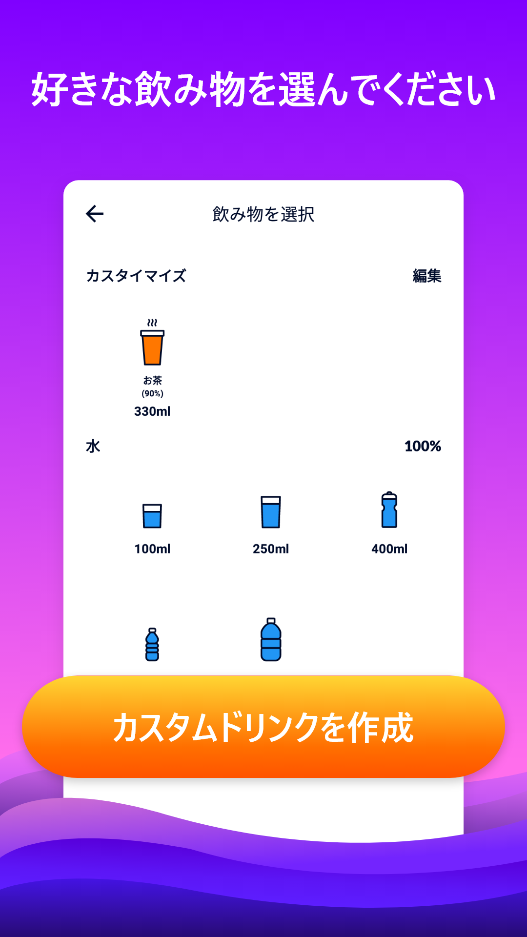 既に用意されたカップを使用して手早く飲み物を追加することもできますが、カスタマイズ機能を使うことでより沢山の色やカップの容量を選ぶことができます。また、アプリはそれぞれの飲み物の水分補給レベルに関する情報を提供します。