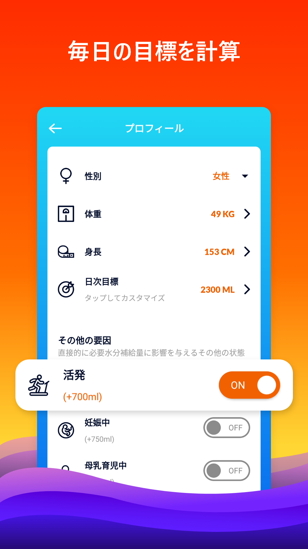 水分補給リマインダーは体重、性別、アクティビティにより自動的にあなたに必要な水分量を計算し、目標を設定します。さらに、妊娠中の方や母乳育児中の方であっても、その方にあった目標設定が可能です。その他にもライフスタイルに合わせたより詳細な目標設定を行うことができます。