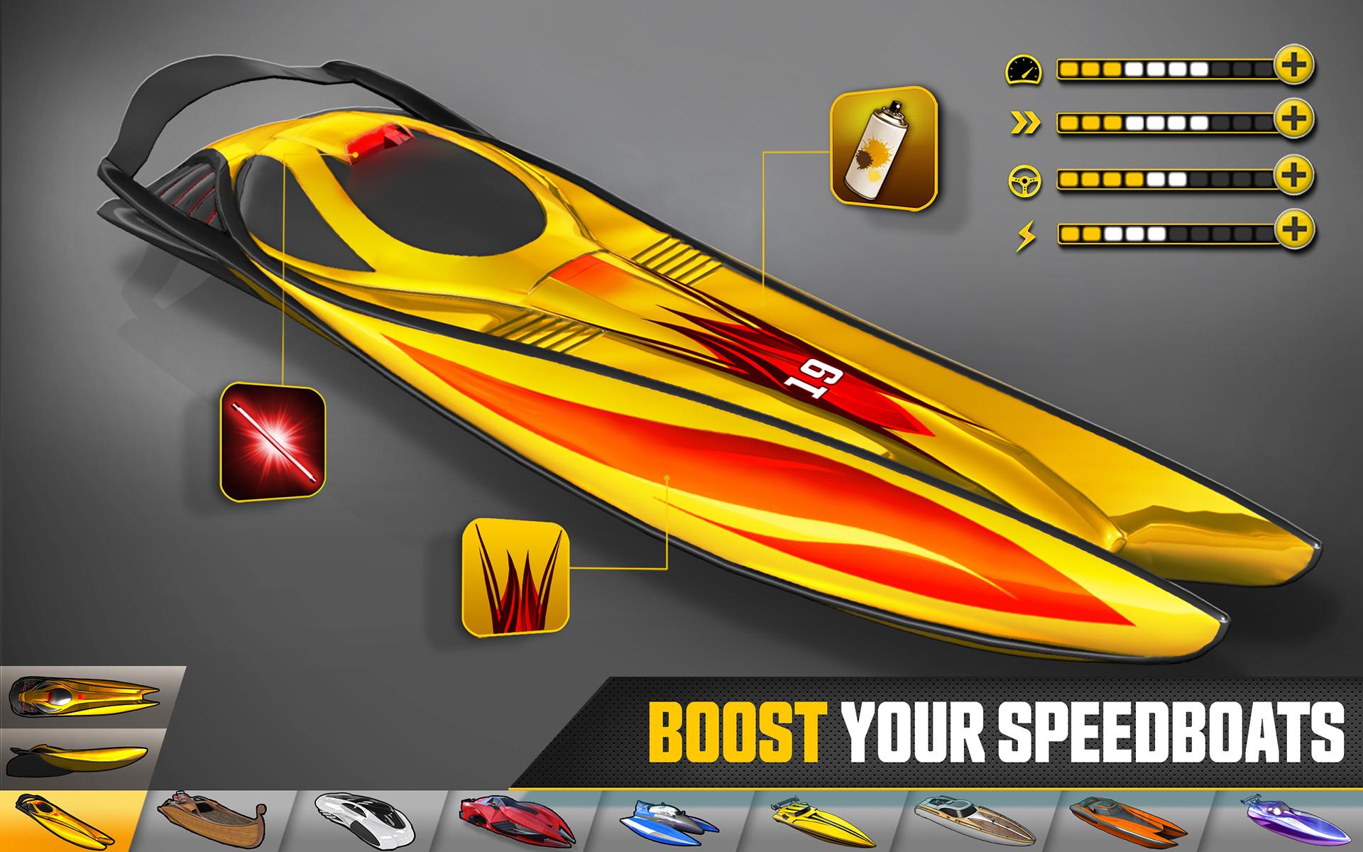 • 20種類以上のボート:スピード、加速、ハンドリングなどをアップグレードして最速マシンを作り上げよう。