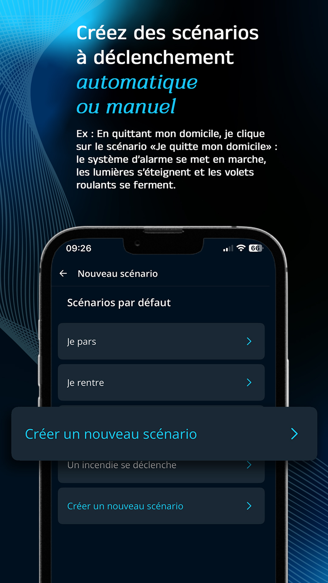 • création de scénarios à déclenchement manuel (par exemple « Je pars » : mise en marche de l’alarme, extinction des lumières, ouverture de la porte de garage) ou sur événement (par exemple sur une détection intrusion : fermeture des stores bannes, éclairage du jardin et des éclairages intérieurs)