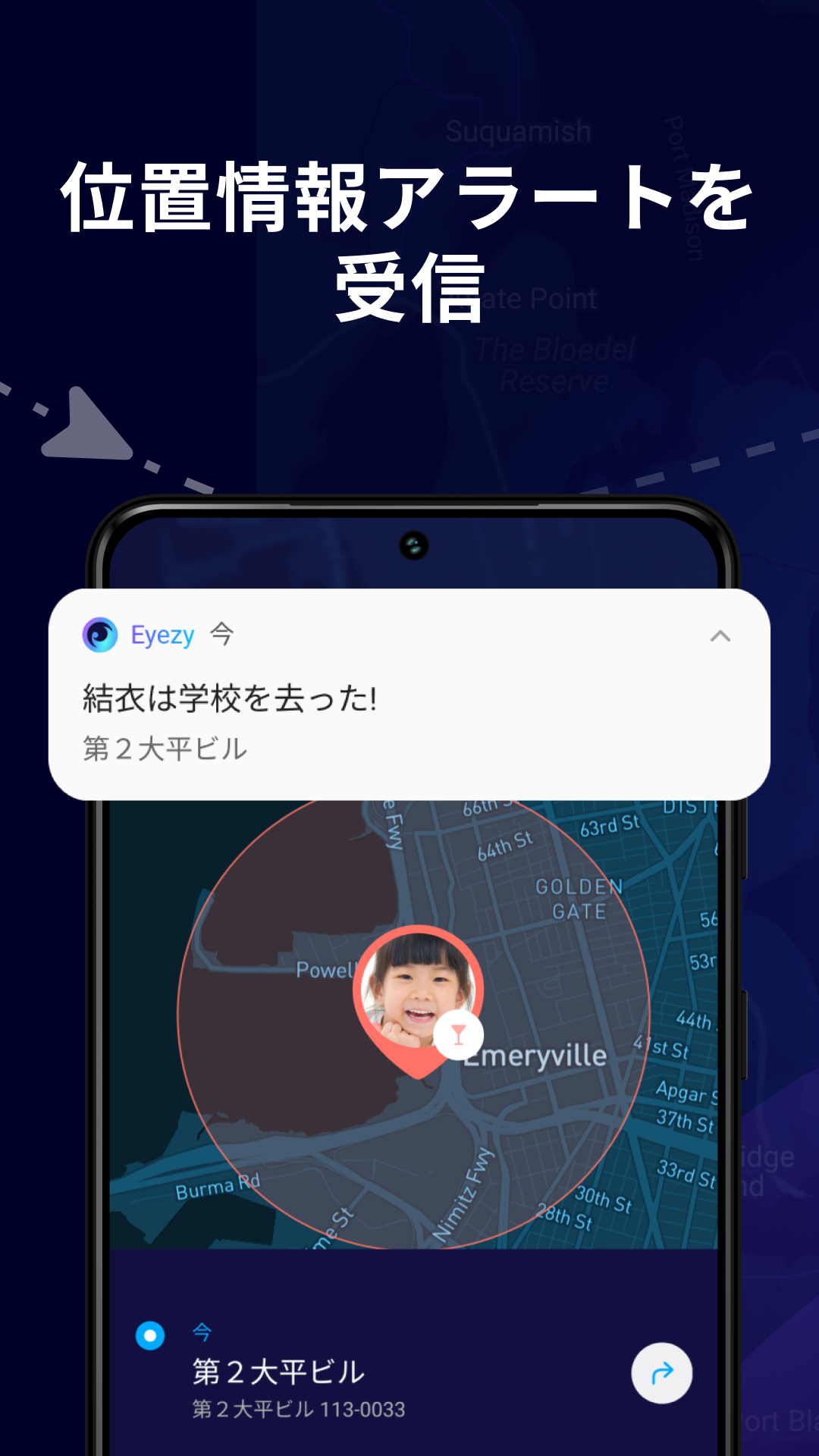 - 保護者の方には、お子さまの位置情報が即座に通知されます。