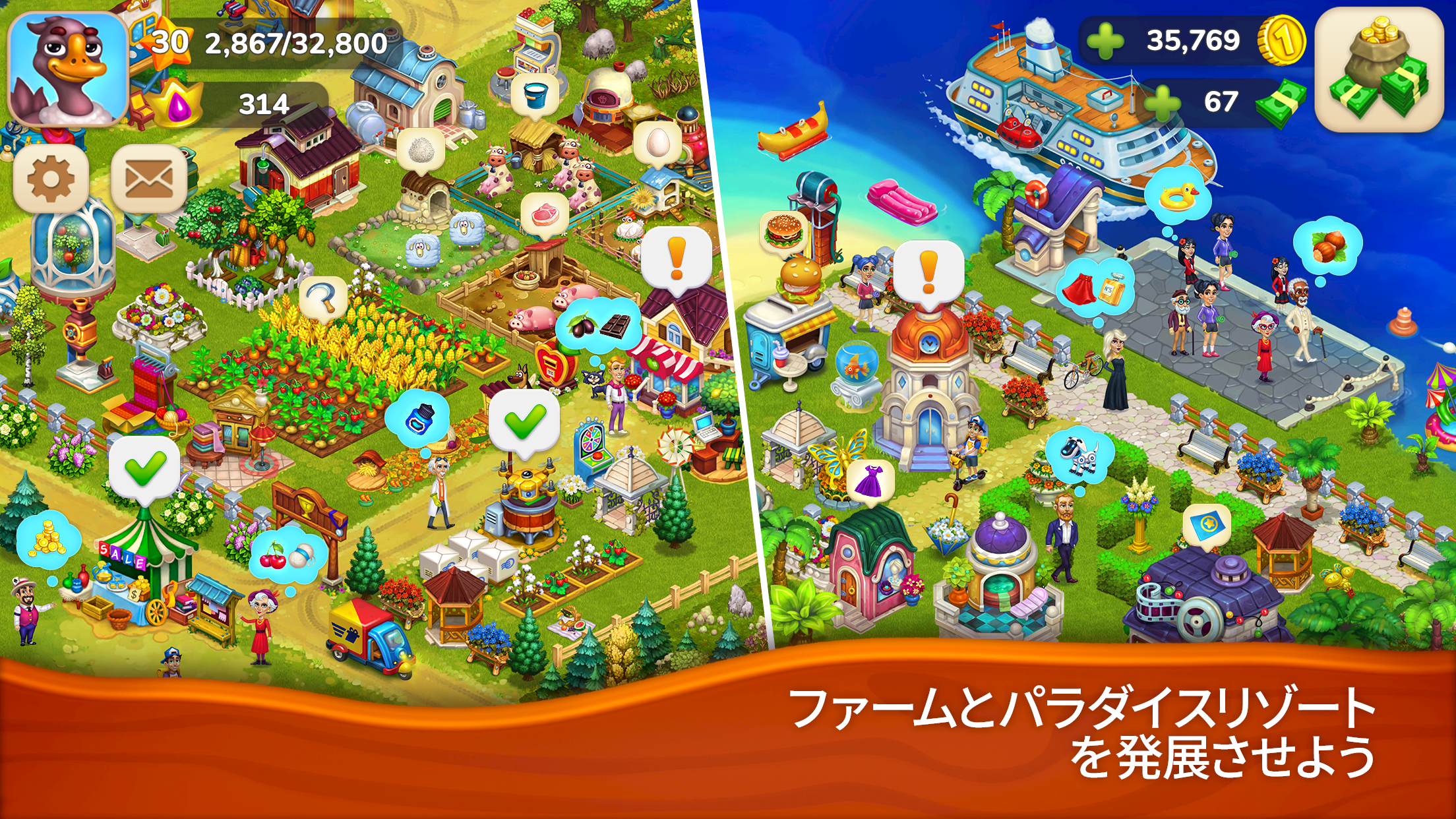 ここではあなたは農場のオーナーです。新しい素晴らしい領土を探索して開発し、農場を拡大して装飾しましょう。さまざまな美しい建物と工場を建設して。可愛らしい家畜を育てます。 作物を育てて商品を生産。住民たちの注文に応じ、近所の人たちとやり取りします。アイテムを交換して、農場の製品を取引します。