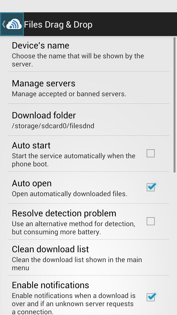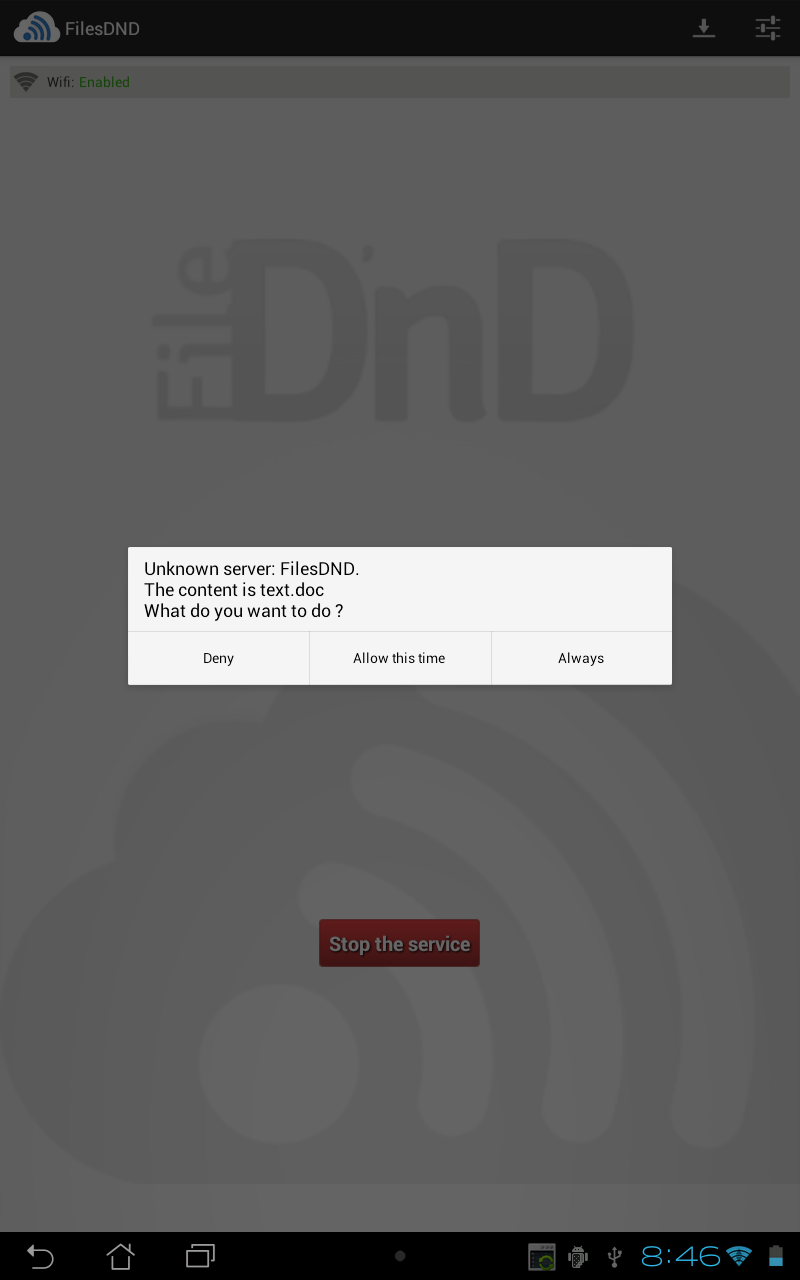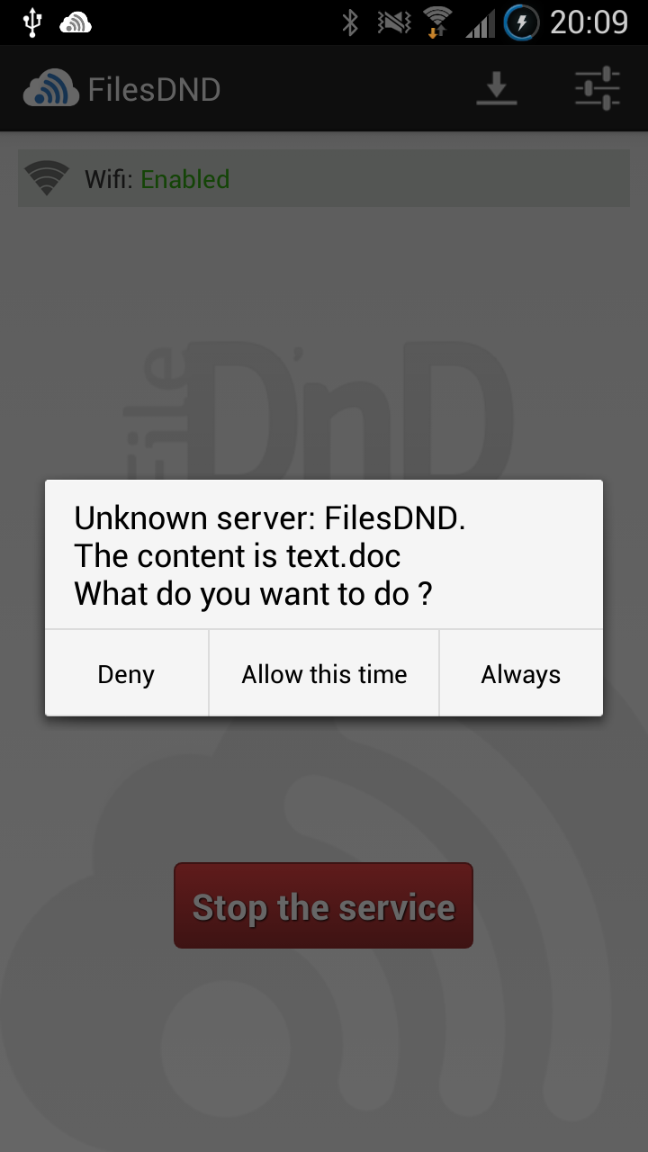 This application has been designed to work as a service in order to avoid constant action on your device when you want to transfer data. Activate it, and you're done with your device!