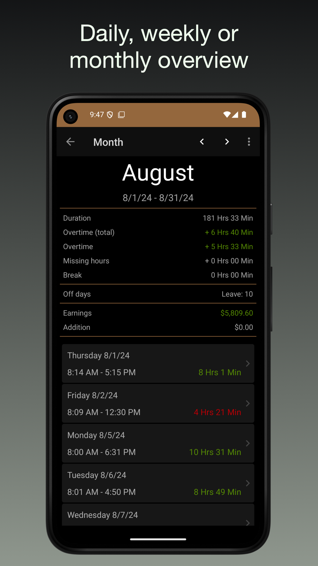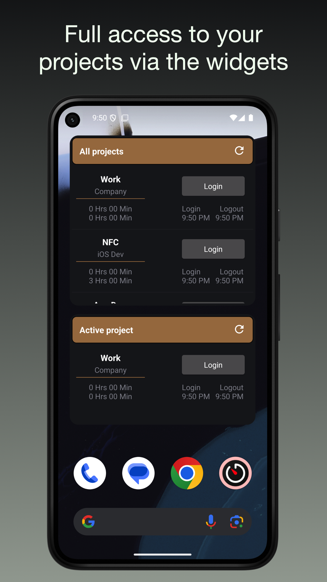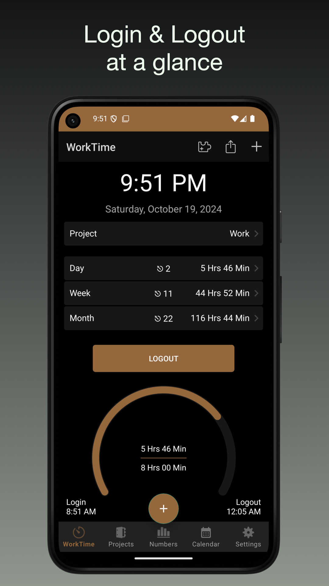- ログイン/ログアウトボタンで勤務時間を追跡します