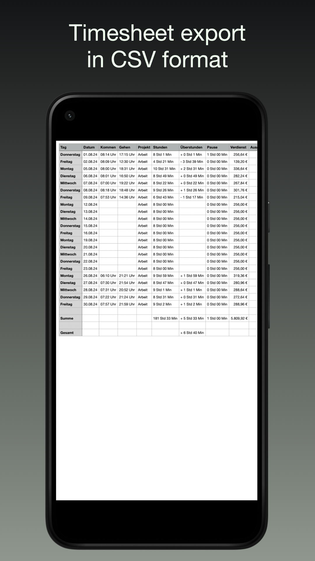 - 電子メール経由で作業時間を CSV としてエクスポートし、Excel、Numbers などで作業時間を共有します (毎日、毎週、毎月、または毎年)