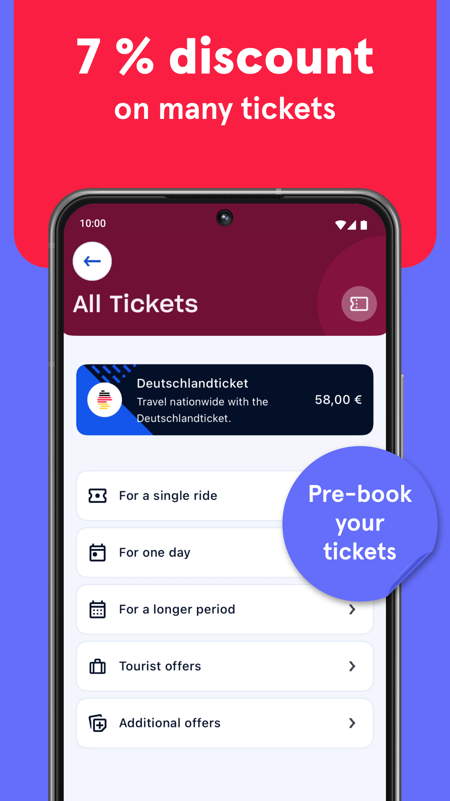 モバイルチケットを注文短距離の移動、片道チケット、1日パスなど、アプリが自動的に最適なチケットを提案します。アプリで購入し、PayPal、SEPA、またはクレジットカードで安全にお支払いいただくと、ほとんどのチケットが7%割引になります。チケットはすぐに利用可能になり、ウォレットに追加することもできます。