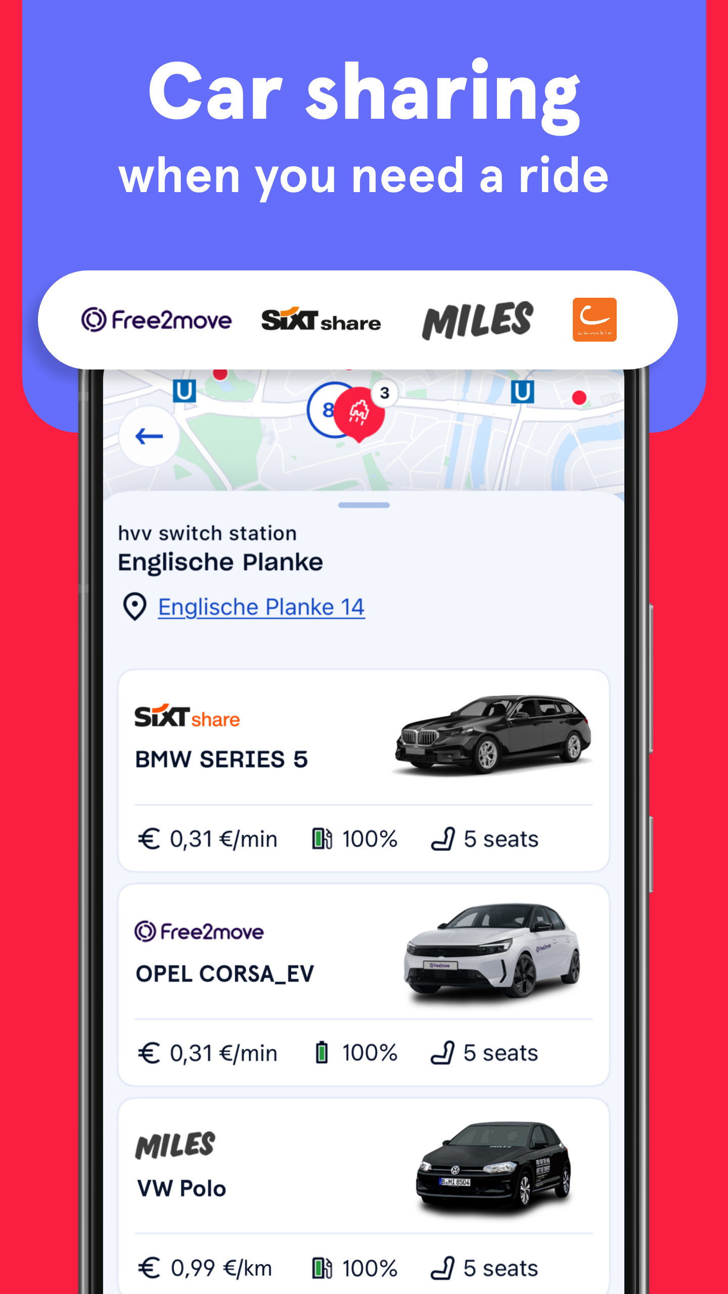 Free2move、SIXT share、MILES、Cambio でカーシェアリングFree2move、SIXT share、MILES なら、お近くでぴったりの車が必ず見つかります。MILES は走行距離に応じて課金され、SIXT share と Free2move は分単位で課金されます。Cambio はまだオープンテスト段階ですが、車種と料金プランに応じて、時間と距離に基づいた料金体系を提供しています。運転免許証の認証、予約、請求書の受け取りなど、すべて HVV スイッチアカウントで行えます。