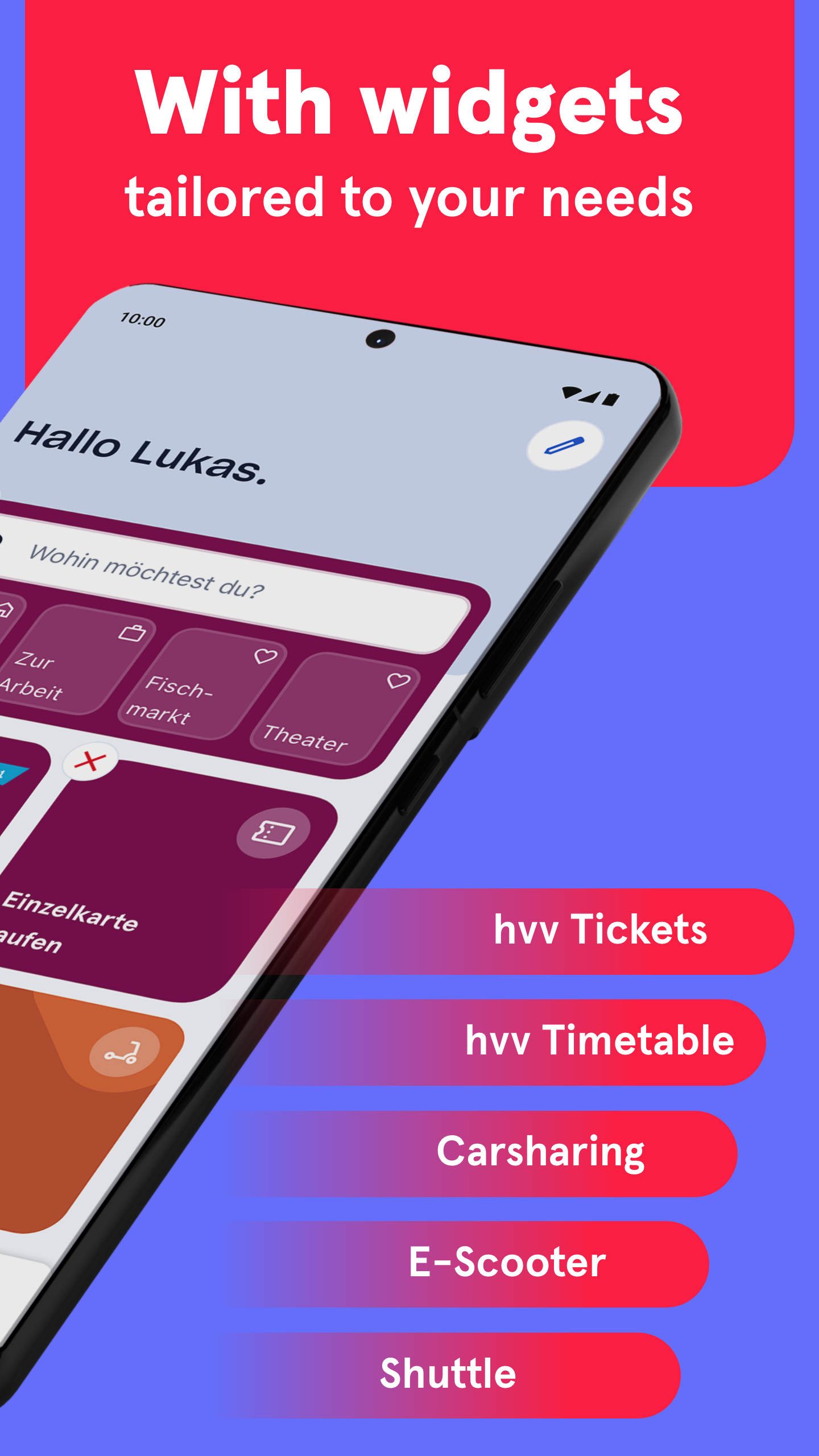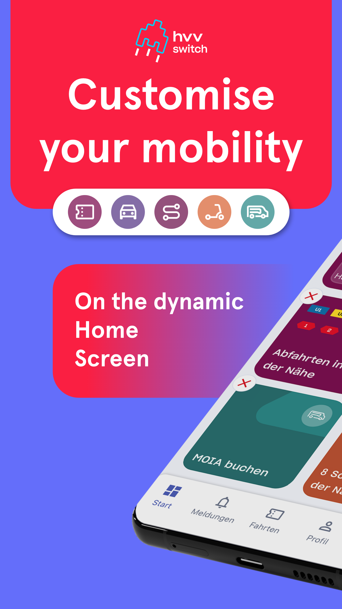 あなたのモビリティ、あなたのアプリ:チケット、時刻表、カーシェアリング、電動スクーター、シャトルなどをカスタマイズできるホーム画面を備えたHVV Switchは、ハンブルクでの日々のパートナーです。