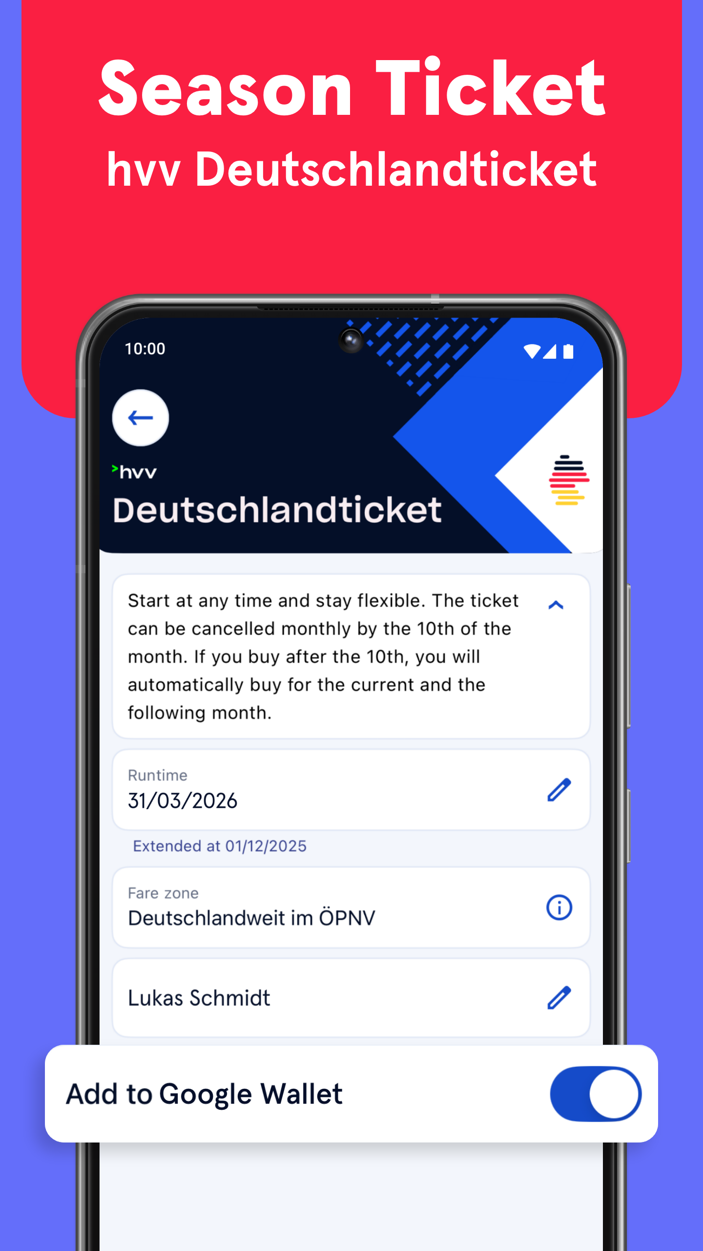 hvv Deutschlandticketわずか数クリックでhvv Deutschlandticketを購入し、すぐに旅に出られます。hvv Deutschlandticketがあれば、地域サービスを含むドイツのすべての公共交通機関を利用できます。ハンブルクにお住まいの方は、初月はご利用日数分のみお支払いいただきます。契約はアプリ内で直接管理できます。