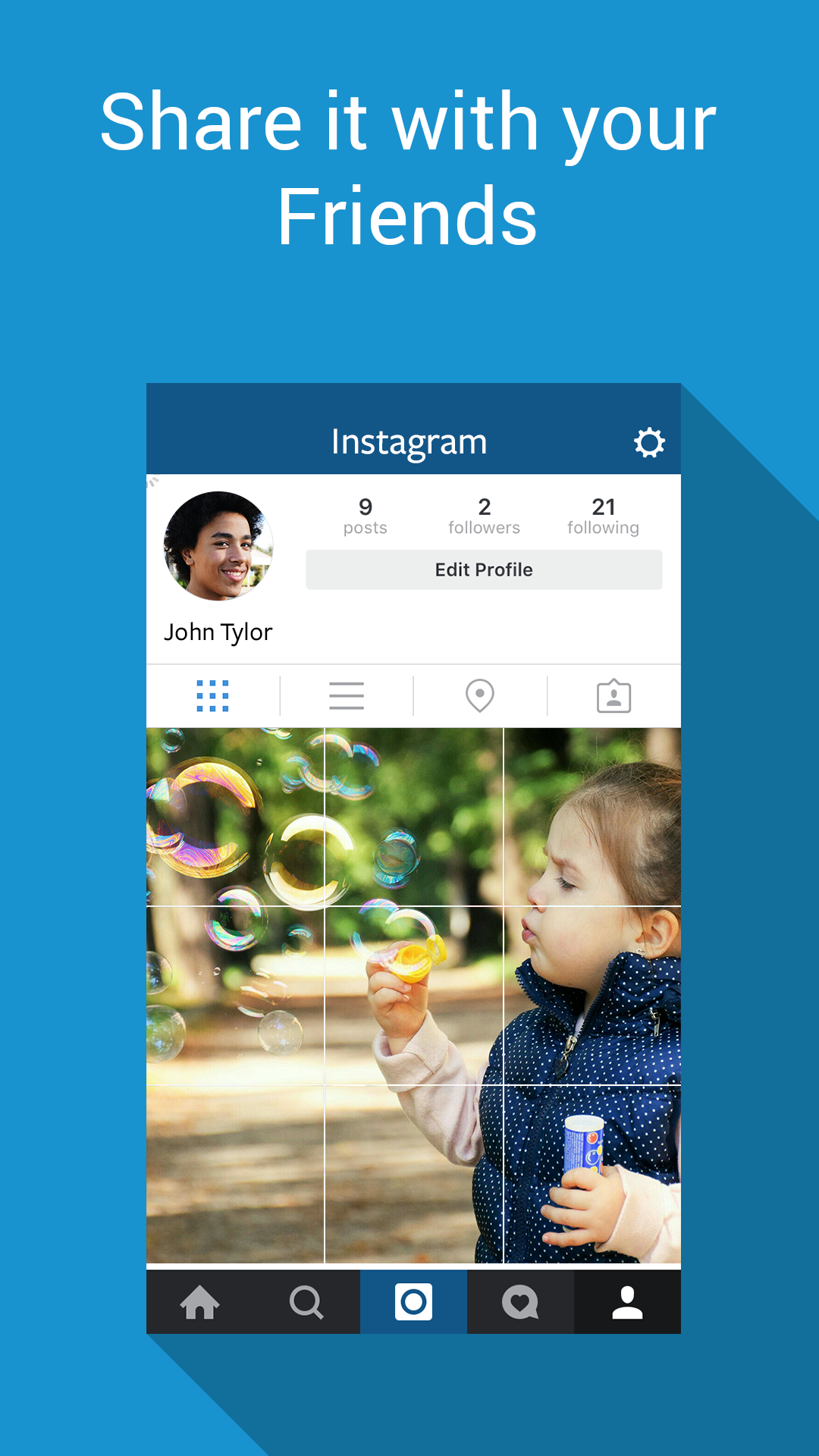 InstaGrid - grids for Instagram to make your picture in grid and post it to Instagram. join the latest trend among instagram users with insta tile maker app. make your photo tile and post it in a grid in your instagram profile. make your photos in 9 grids with one click You can take a new picture from camera or select any gallery picture from camera roll. you can play around with your images and make editing within our app. you can also share your pictures to messenger,whatsapp, snapchat and other social media across android along with instagram. grids can be selected and also there is a retake option. instagrids can be replaced with other images.PicGrid is easy to use and has one click sharing. you can post your pic grid using share button.