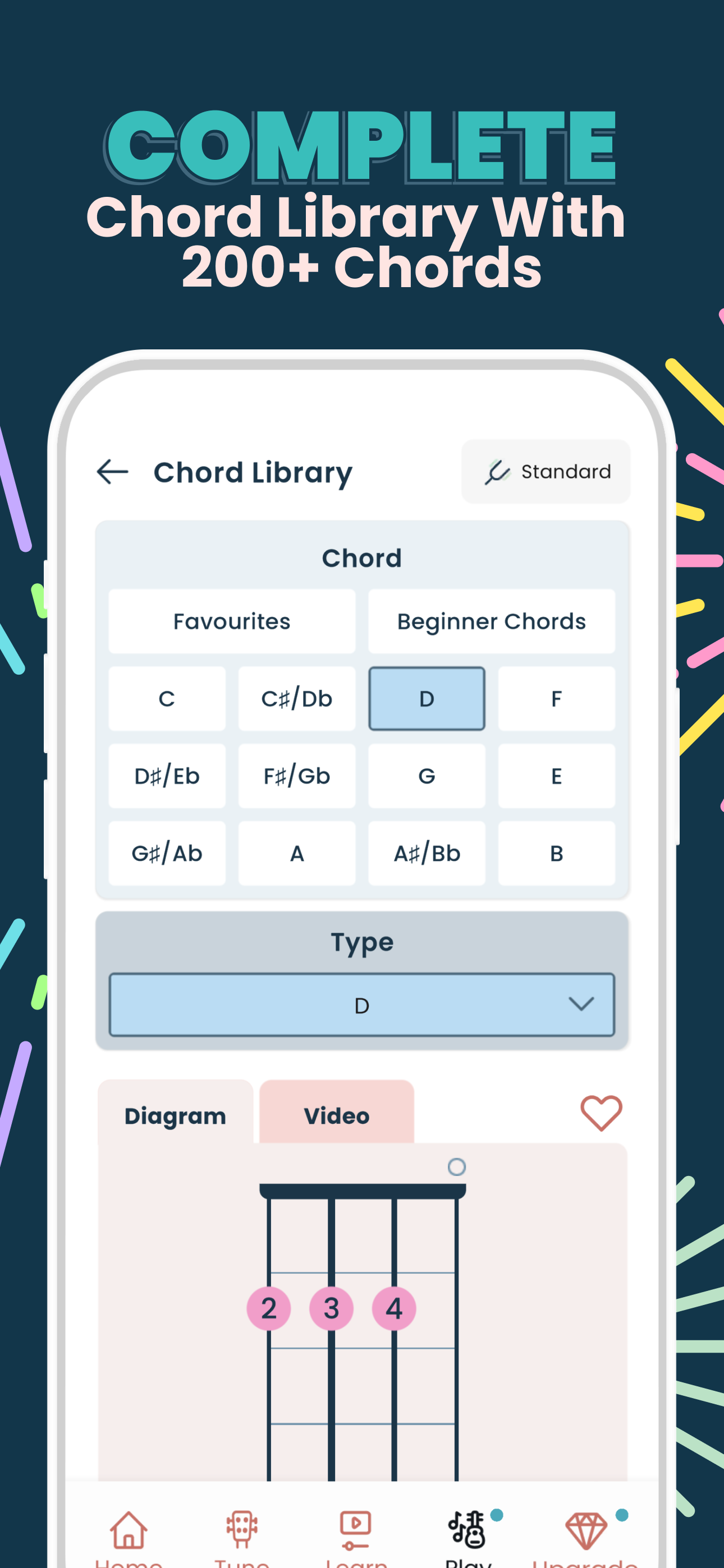 🎼 ウクレレの種類(ソプラノ、コンサート、テナー、バリトン)を選択し、チューニングモード(標準、オルタナティブ、ローGチューニング)を設定できます