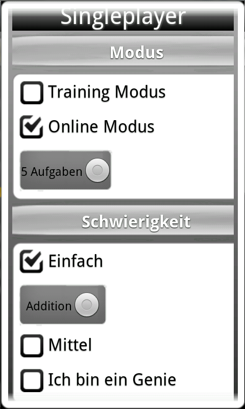 Im Singleplayermodues gibt es 3 Schwierigkeitsgrade und folgende Aufgabentypen