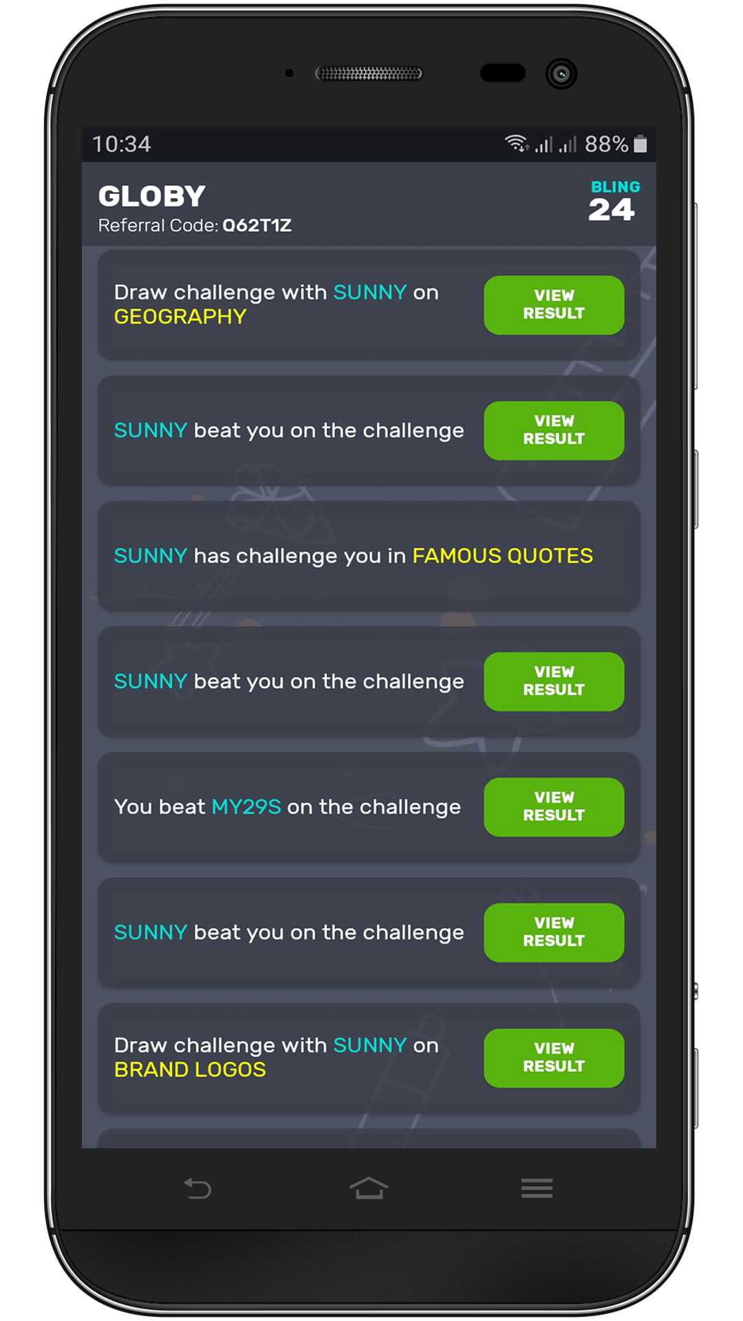 Quickplay - lets you test your knowledge on various topics. Upon selecting your chosen topic, you can challenge a random opponent for a Quickplay game. After the quiz you will be notified when your opponent finished and see who won in that round.