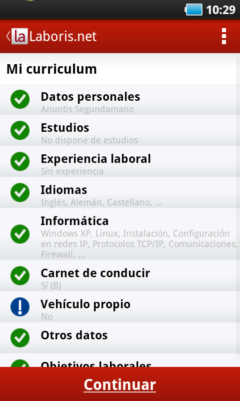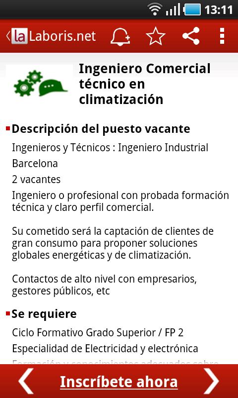 • INSCRÍBETE A OFERTAS. Tendrás información detallada de cada oferta de empleo (descripción de la empresa, funciones a realizar, requisitos mínimos,...) y podrás enviar tu CV a las empresas sin salir de la aplicación.