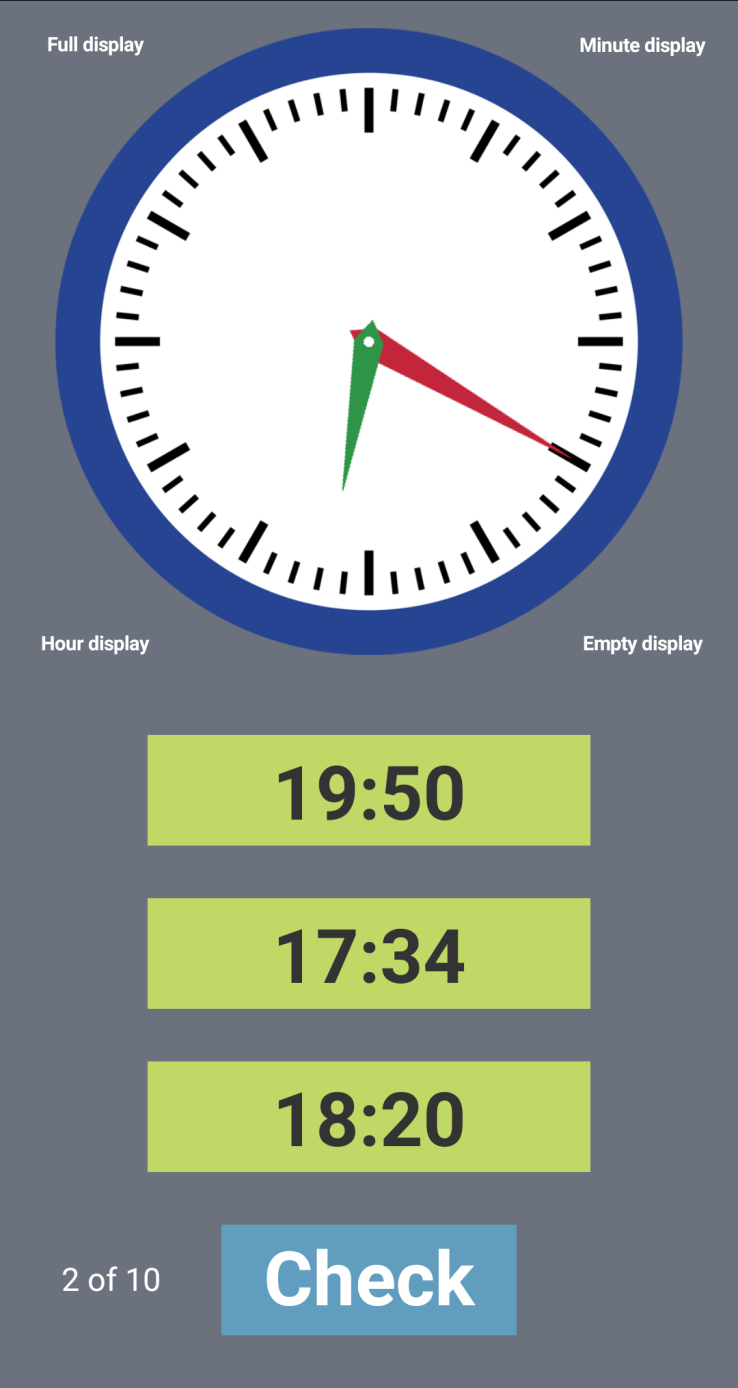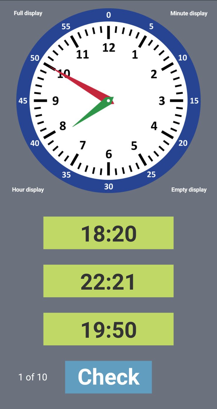 If you want to help your students learn to read the clock and plan school, sport or sleep, this app is made for you. You can choose among different displays, to increase difficulty. Touch and hold "Correct or Wrong" to continue. Hour format can be AM/PM or 24-hours.