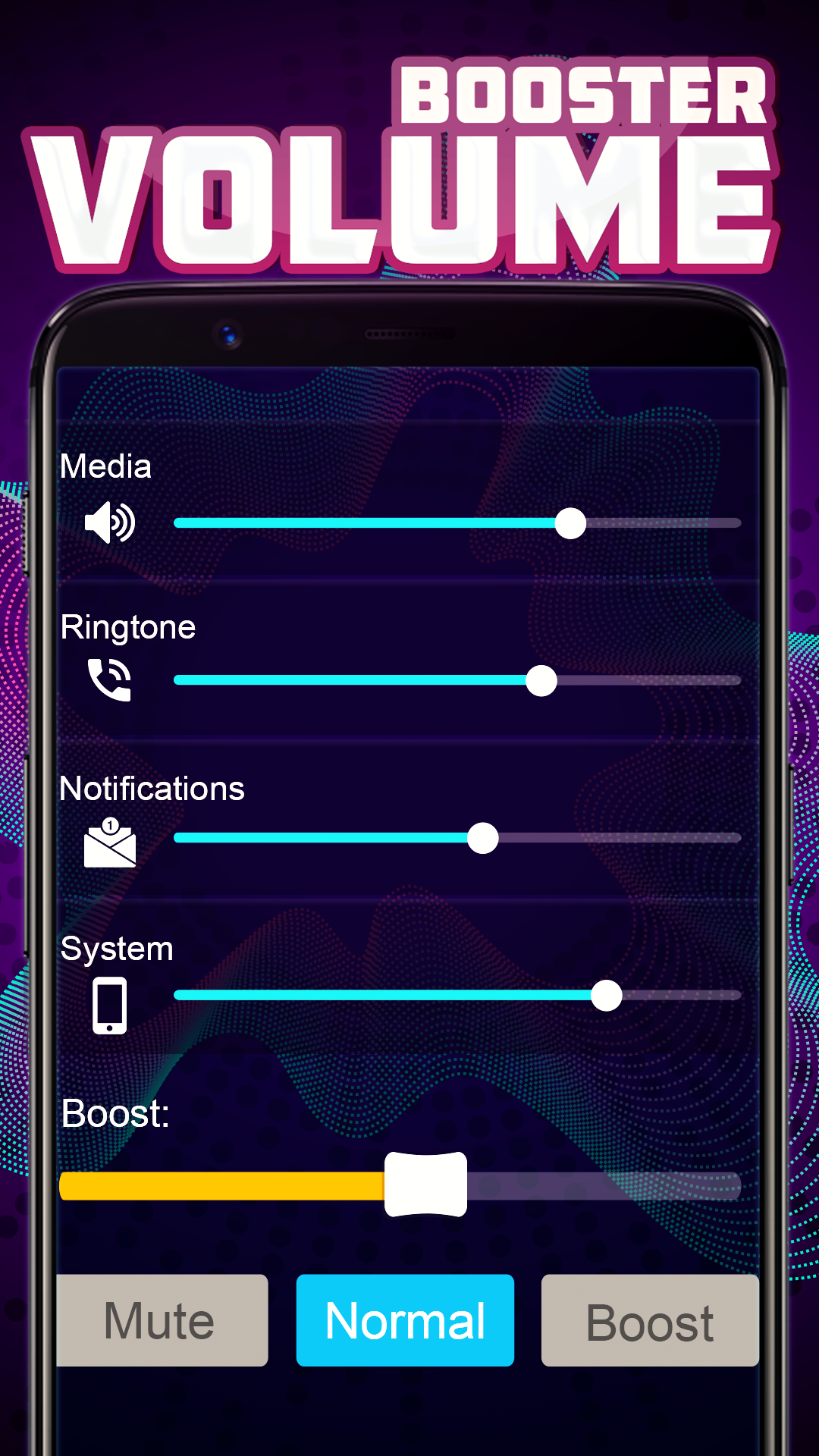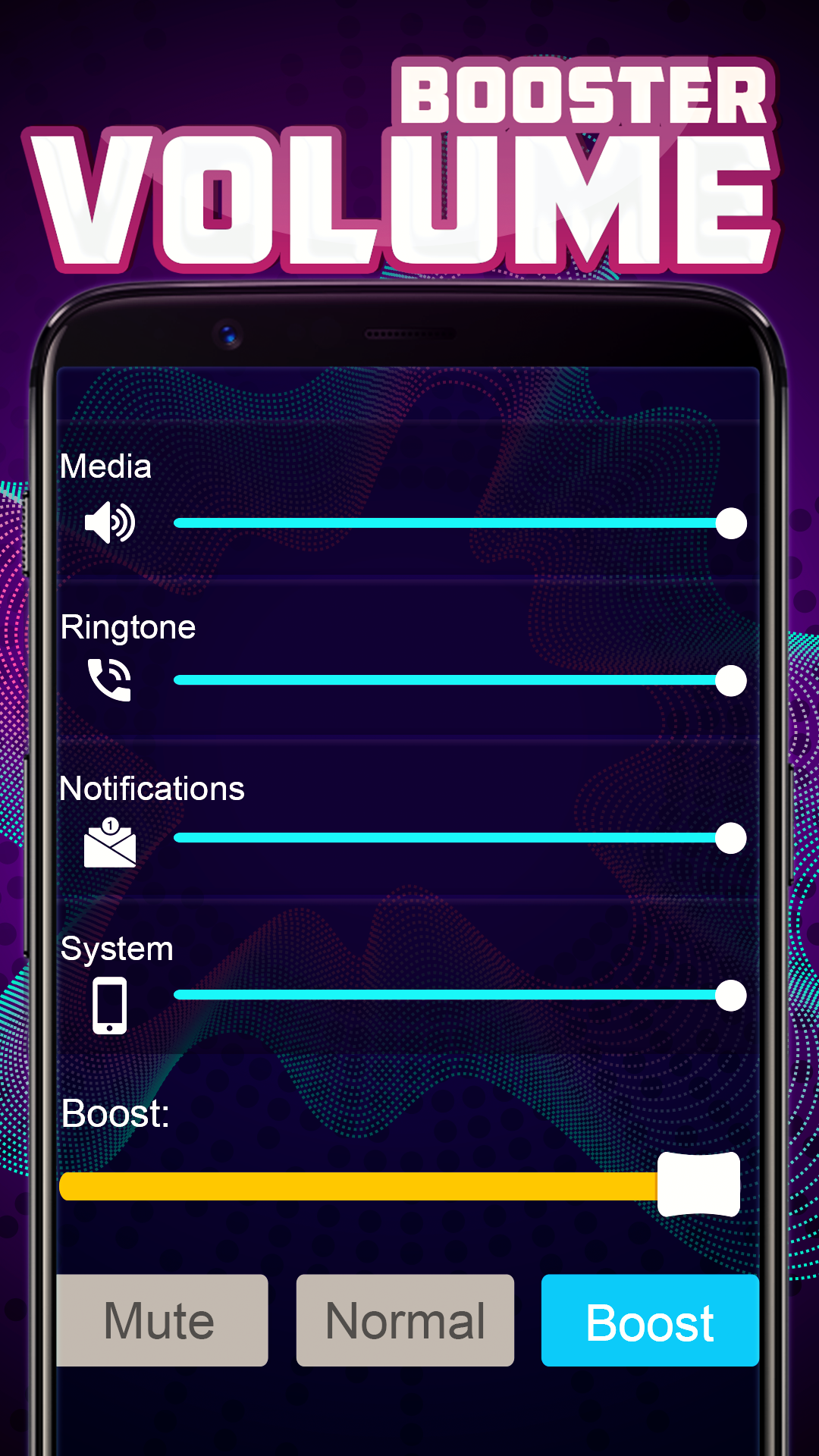 Sound volume booster is a useful tool for increasing sound volume of your phone to maximum. You can set sounds to 100% of phone speaker capabilities so you will now hear your ringtone and mp3 sounds louder and more clear. Our sound booster contains 4 seekbars and each of them is responsible for sound volume of ringtone, system, notifications and media volume. You can boost volume and increase sound quality in one click!