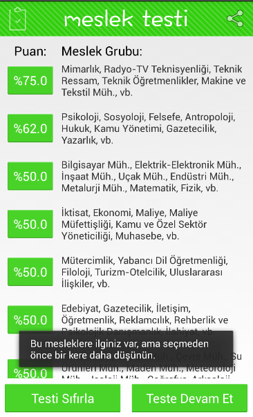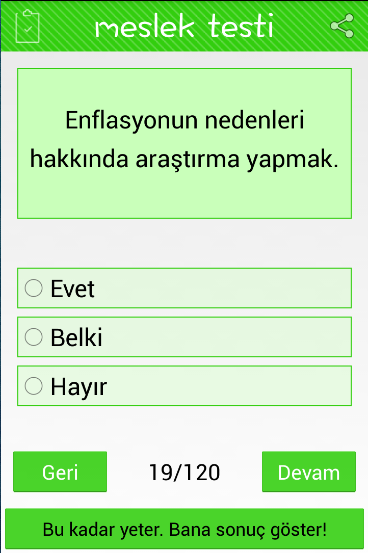 Meslek Testi ile mesleki eğilimlerinizi ölçün! Marketteki ilk ve tek meslek testi uygulaması. Yalnızca 5-10 dakikanızı ayırarak bu testi uygulayın ve hangi mesleki alanlara ilgili olduğunuzu görün. Üniversite tercih döneminin başladığı şu günlerde, yanlış tercih yapmadan, bu testi uygulayın. Özellikler: ★ İlgi alanınızı ölçmek için hazırlanmış 120 soru ★ Testi hızlı ve hatasız doldurabilmeniz için hazırlanmış tasarım. ★ 10 farklı meslek grubuna ait mesleki eğilim puanınız. "Hangi mesleği seçmeliyim?", diyorsanız cevabı bu uygulamada! Anahtar kelimeler: meslek testi, meslek