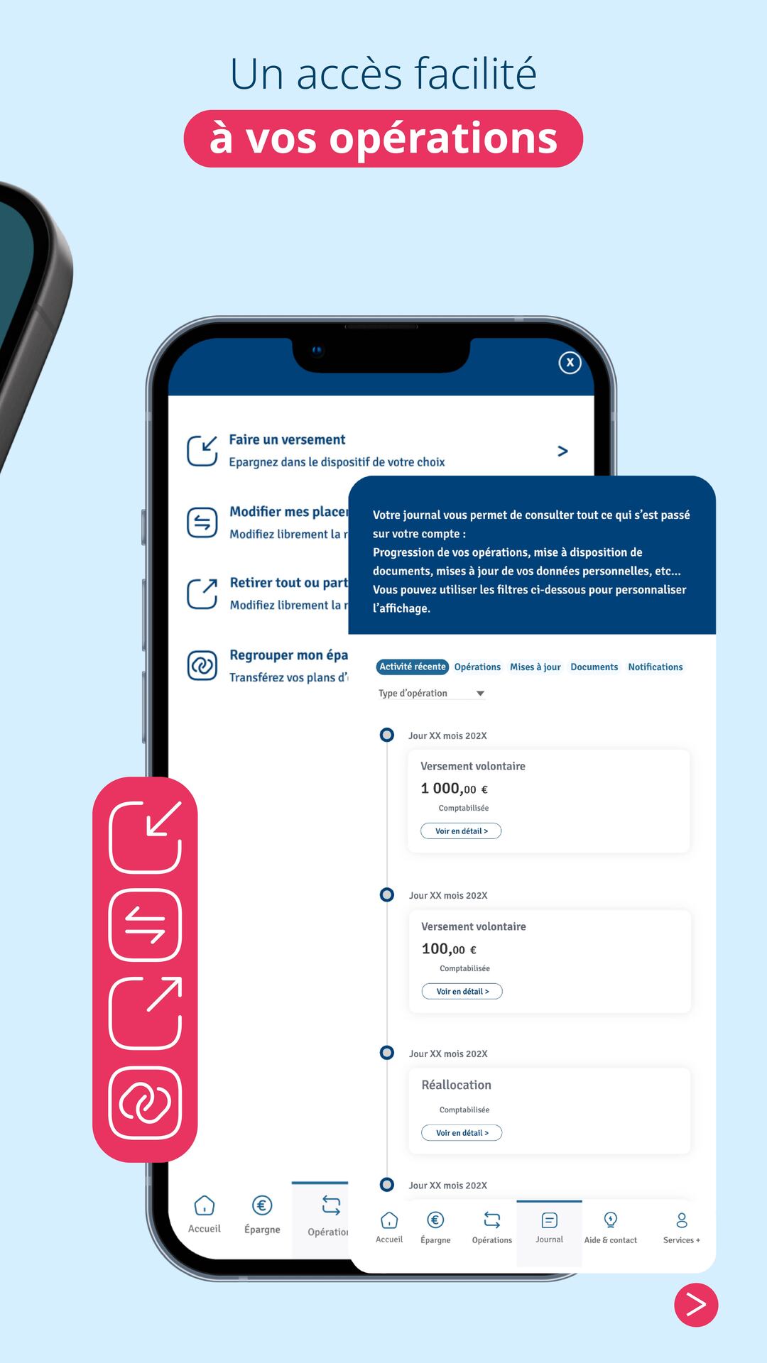 Votre application évolue. Merci de la mettre à jour. Différents correctifs d’affichage ont été appliqués dans votre espace personnel, notamment sur les parcours transactionnels. La réactivité et l’aide à la saisie ont été améliorées. La gestion de la connexion internet et des terminaux lors de l’authentification a été optimisée. Dans un souci constant d’écoute, nous poursuivons l’amélioration de votre expérience.